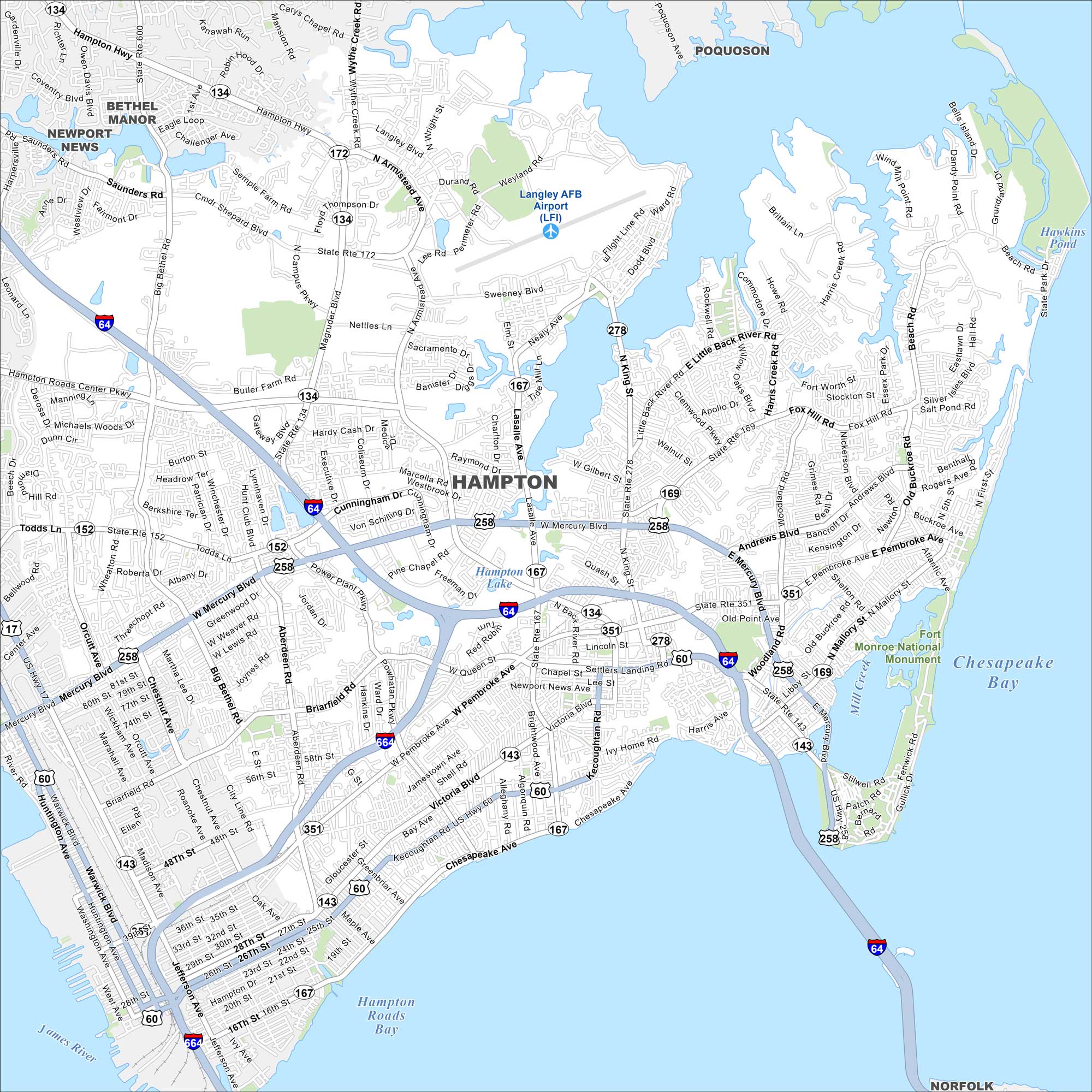 Our map shows Hampton, which is on the Virginia Peninsula. It’s surrounded by the Chesapeake Bay and Hampton Roads. You’ll find highways, streets, lakes and much more on our map.