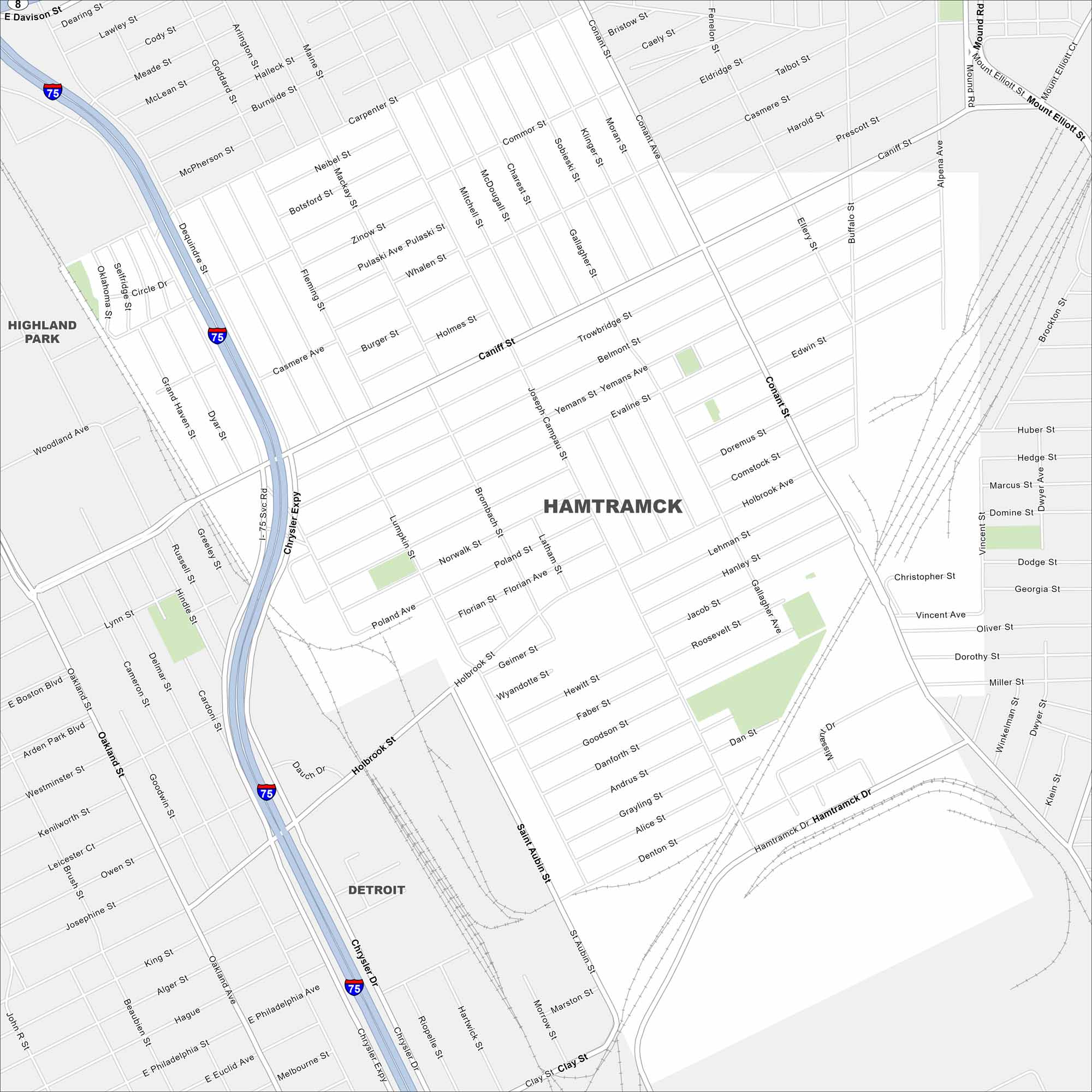 Hamtramck is a small city enclosed entirely by Detroit. On our map, it’s easy to see how tightly packed its streets are. It exists as its own city with a strong industrial history.