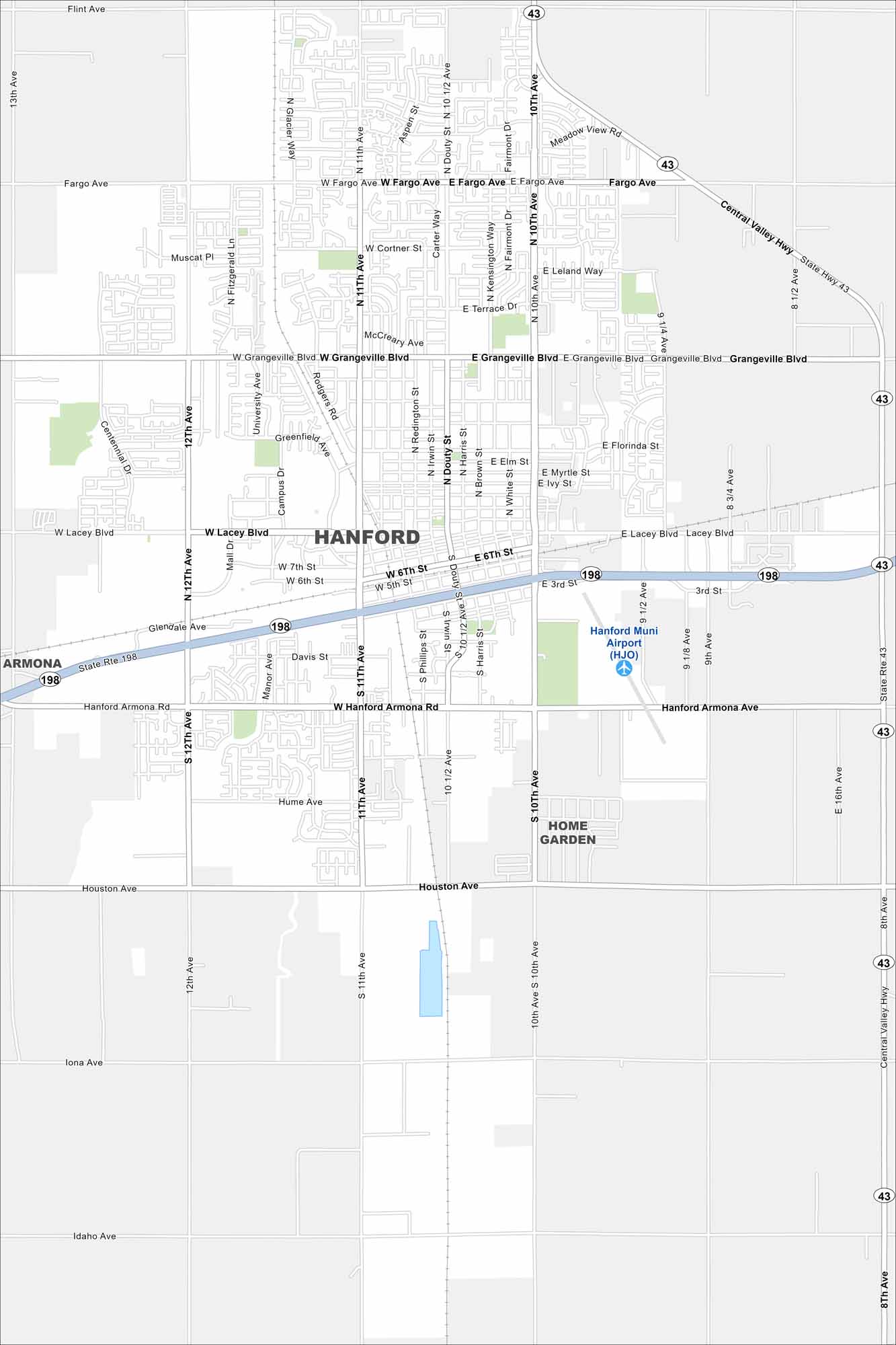Hanford sits in California’s Central Valley between Fresno and Visalia. Our map shows the roads, railways and green spaces in the city. Farming dominates the region with its fertile soils and irrigation canals.