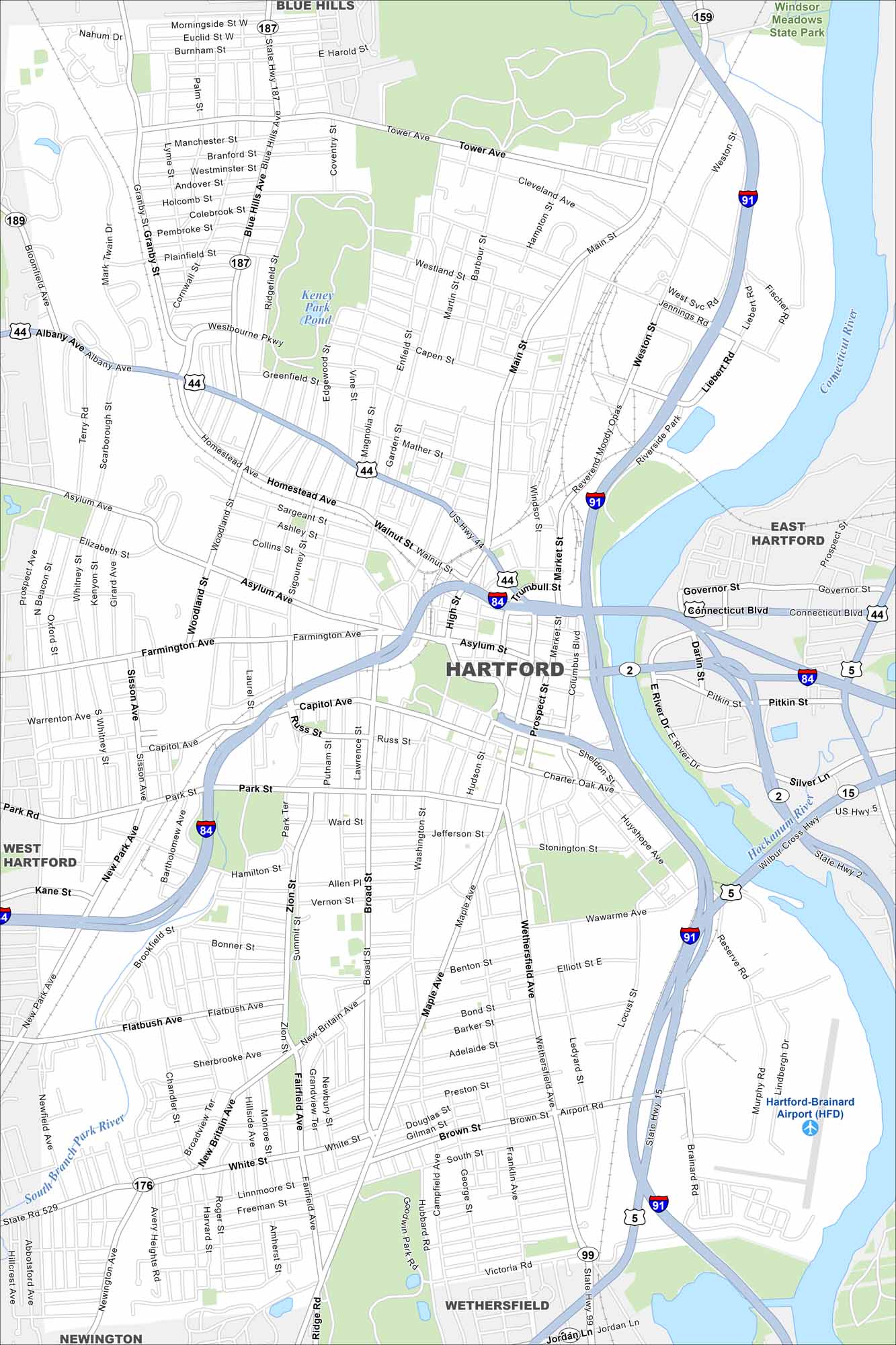 Hartford sits along the Connecticut River in the north-central part of the state. On our map, you’ll notice the city’s grid cut by the highway loops. This is the home of the former NHL Hartford Whalers until they left in 1997.