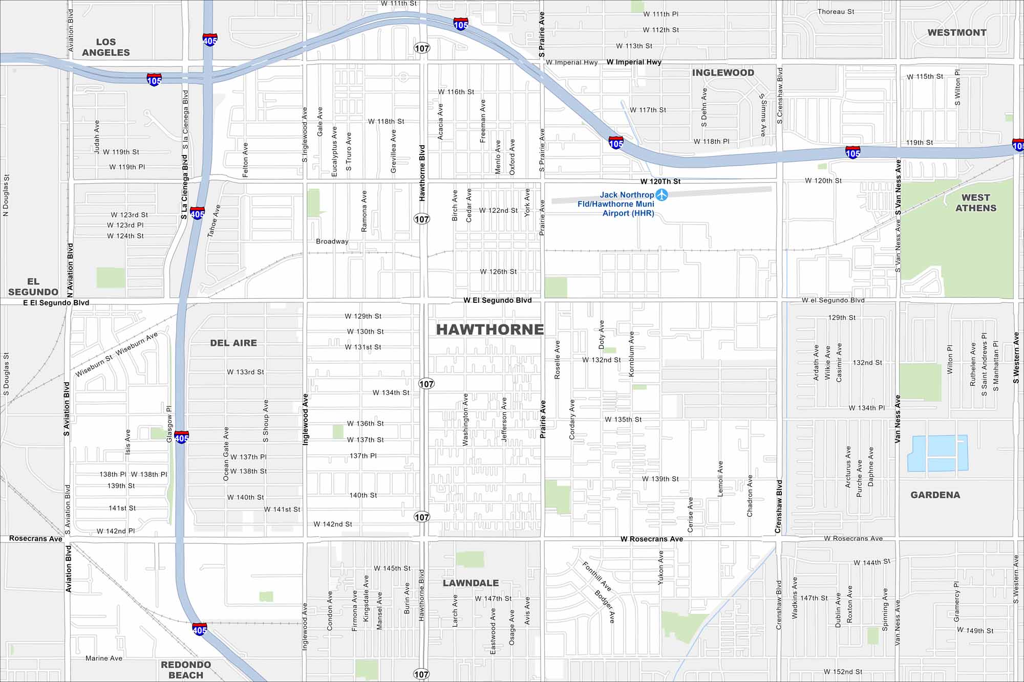 Hawthorne lies in Los Angeles County, just inland from the coast. On our map, you’ll see it boxed in by major freeways. The city is close to both LAX and the Pacific Coast.