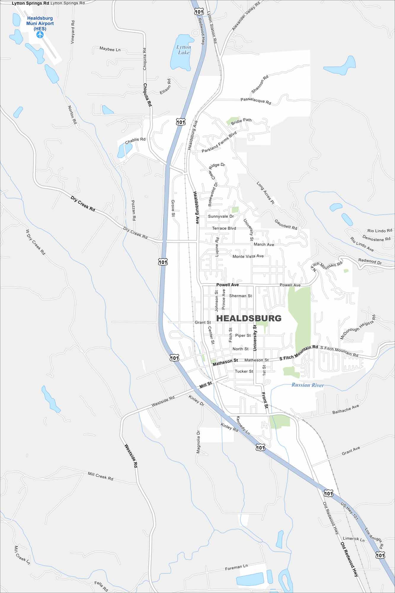 Healdsburg is in northern Sonoma County, surrounded by vineyards. Our map shows the Russian River winding through the area. Hills and wine country frame the city on all sides.