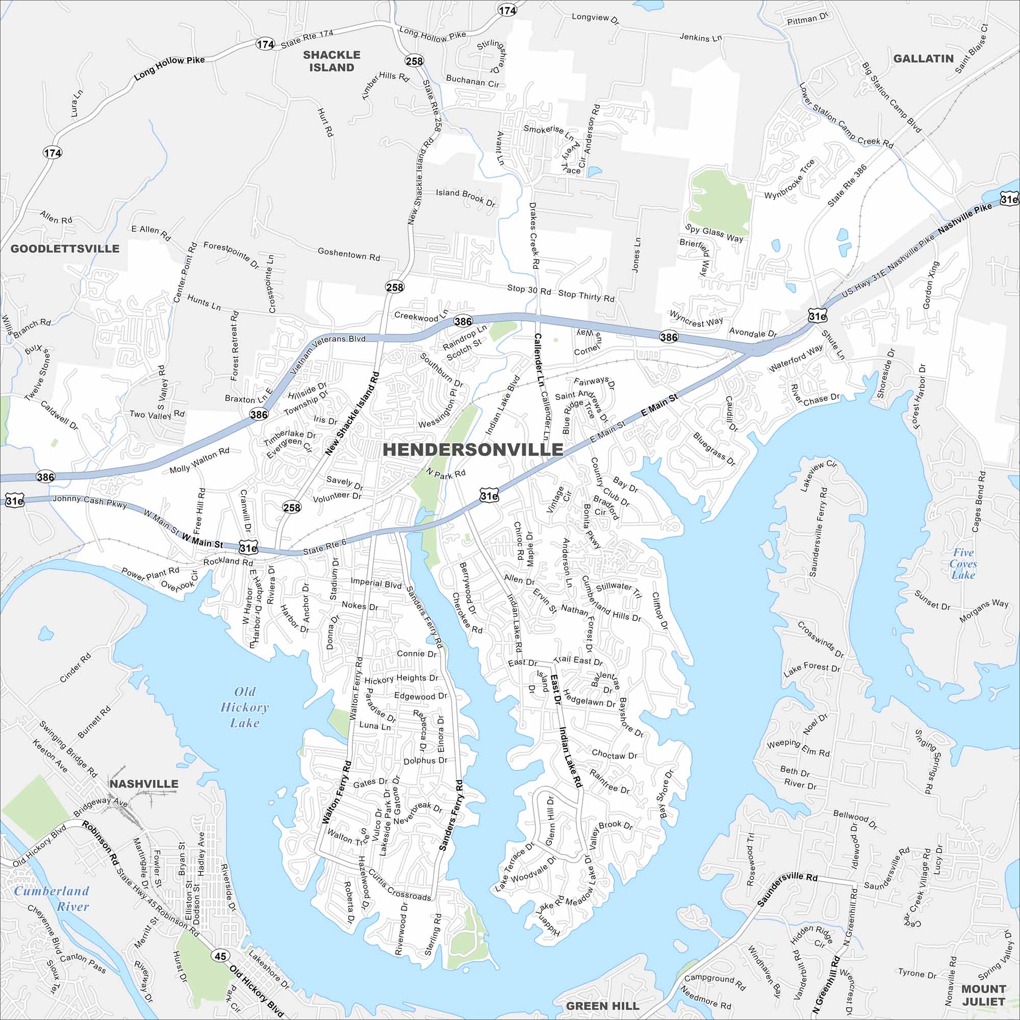Explore our map of Hendersonville along the shores of Old Hickory Lake. Its roads spread north of Nashville. Water and highways are both key features here.