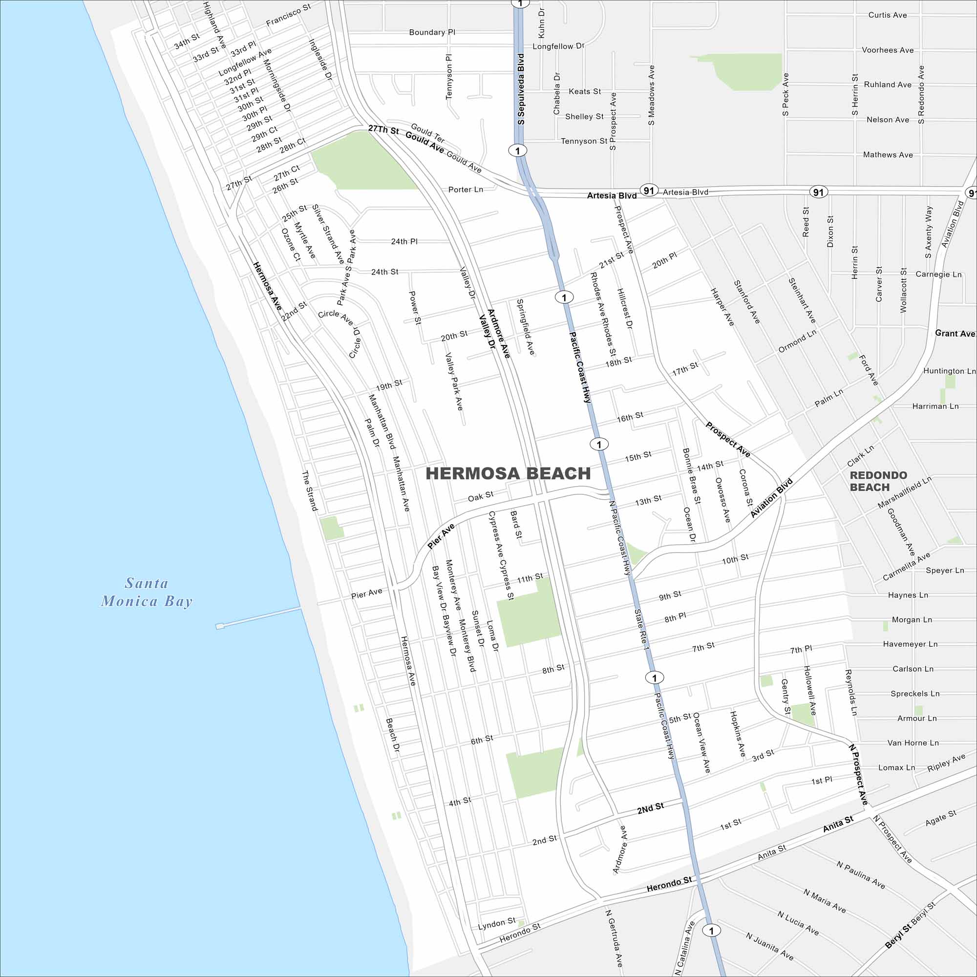 Hermosa Beach sits on the Southern California coast between Manhattan Beach and Redondo Beach. This map shows its location lined by the Pacific shoreline. The Pacific Coast Highway (SR 1) cuts nearby.
