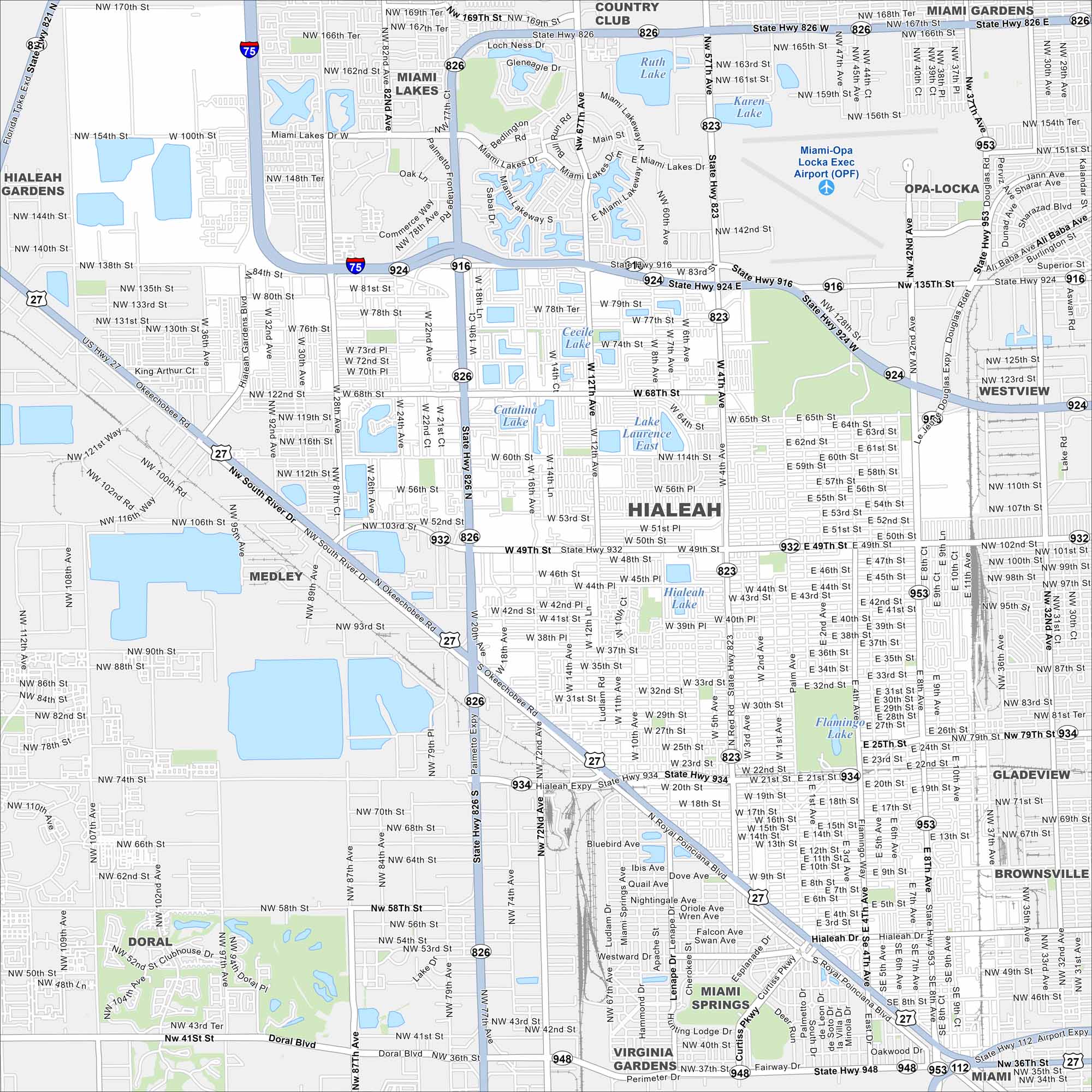 Hialeah sits in South Florida, just northwest of Miami. Our map shows a dense grid of streets. Major highways cut across the city, linking it to the coast.