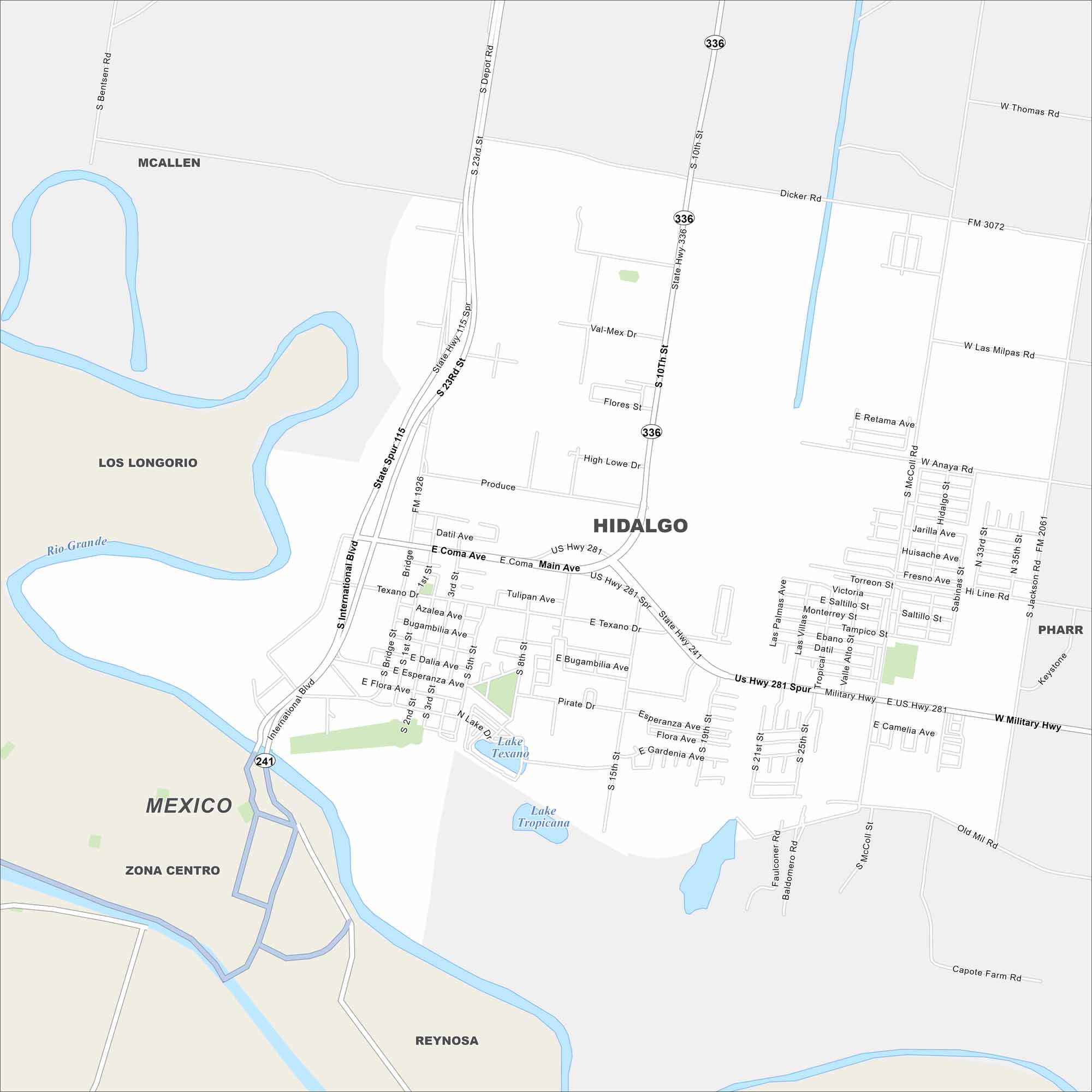 Check out our map of Hidalgo right on the US-Mexico border. The Rio Grande runs along its edge. Bridges link it directly to Reynosa, Mexico.
