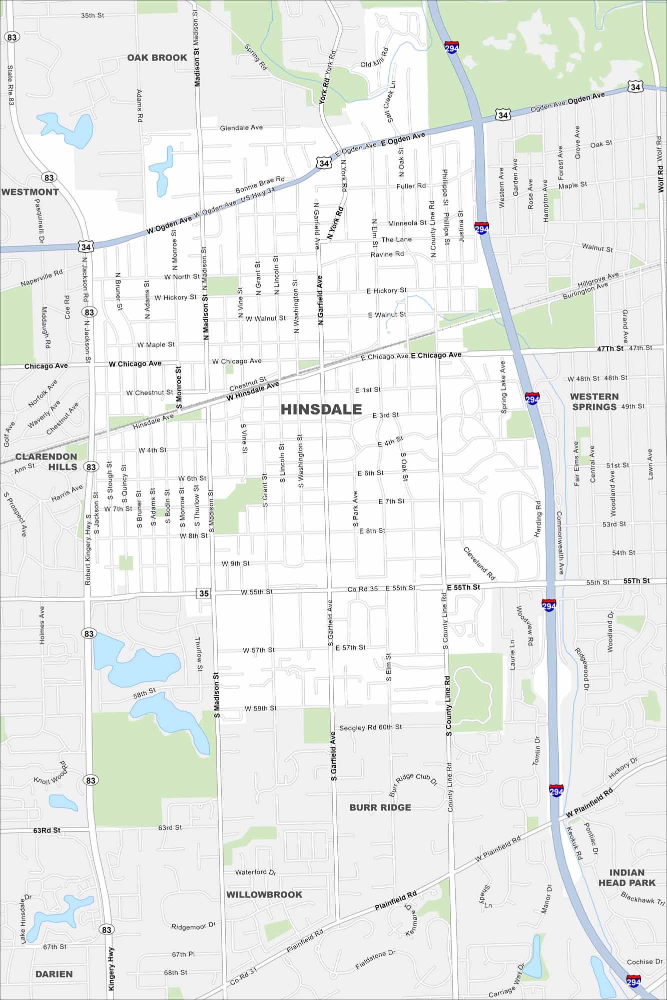 Hinsdale is a suburb west of Chicago. This map highlights its highways, roads and streams cutting through. It’s known for historic homes and easy access to the city.
