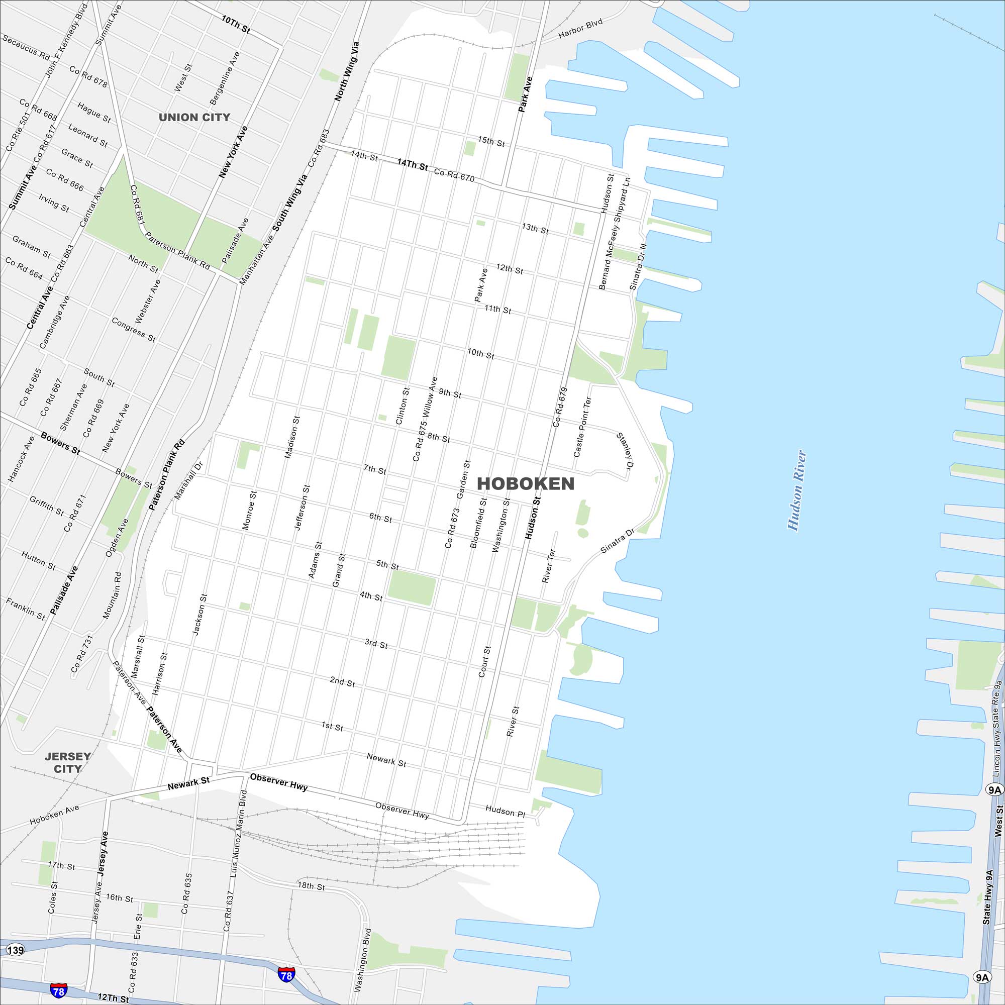 Hoboken is located on the west bank of the Hudson River across from Manhattan. Our map shows a tight street grid leading to the waterfront. It’s often called the “birthplace of baseball” because the first recorded game was played here.