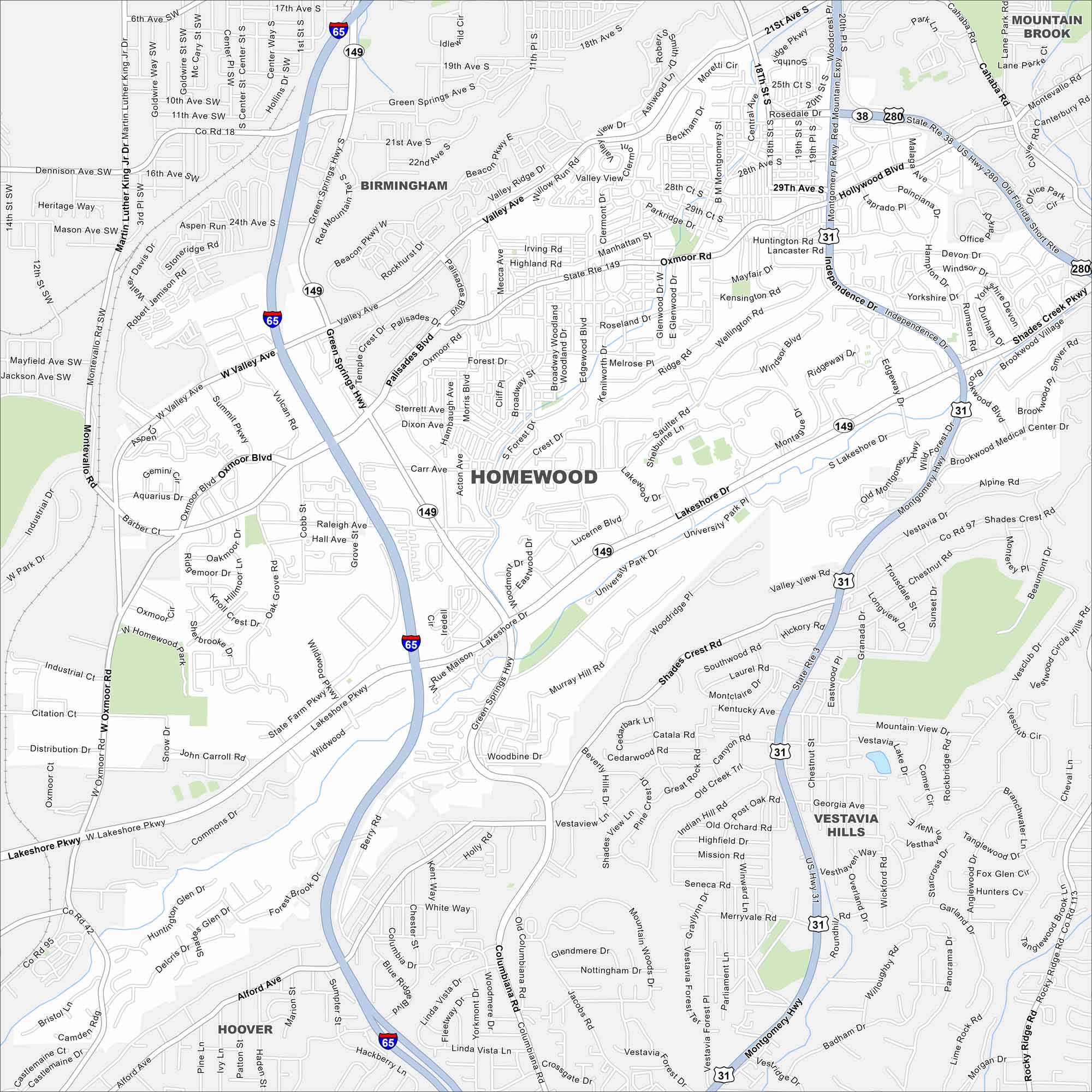 Our map of Homewood shows it tucked beside Birmingham. Neighborhoods line the ridges and valleys. Samford University is a central landmark.