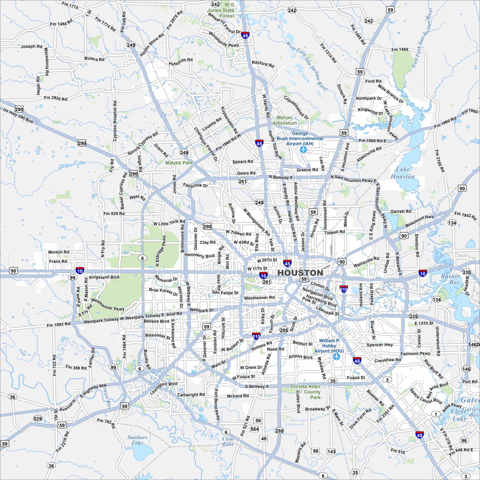 Our map of Houston shows a network of highways circling and crossing the city. Buffalo Bayou winds through the downtown area. The city is known as “Space City” because of its role in NASA’s space program.