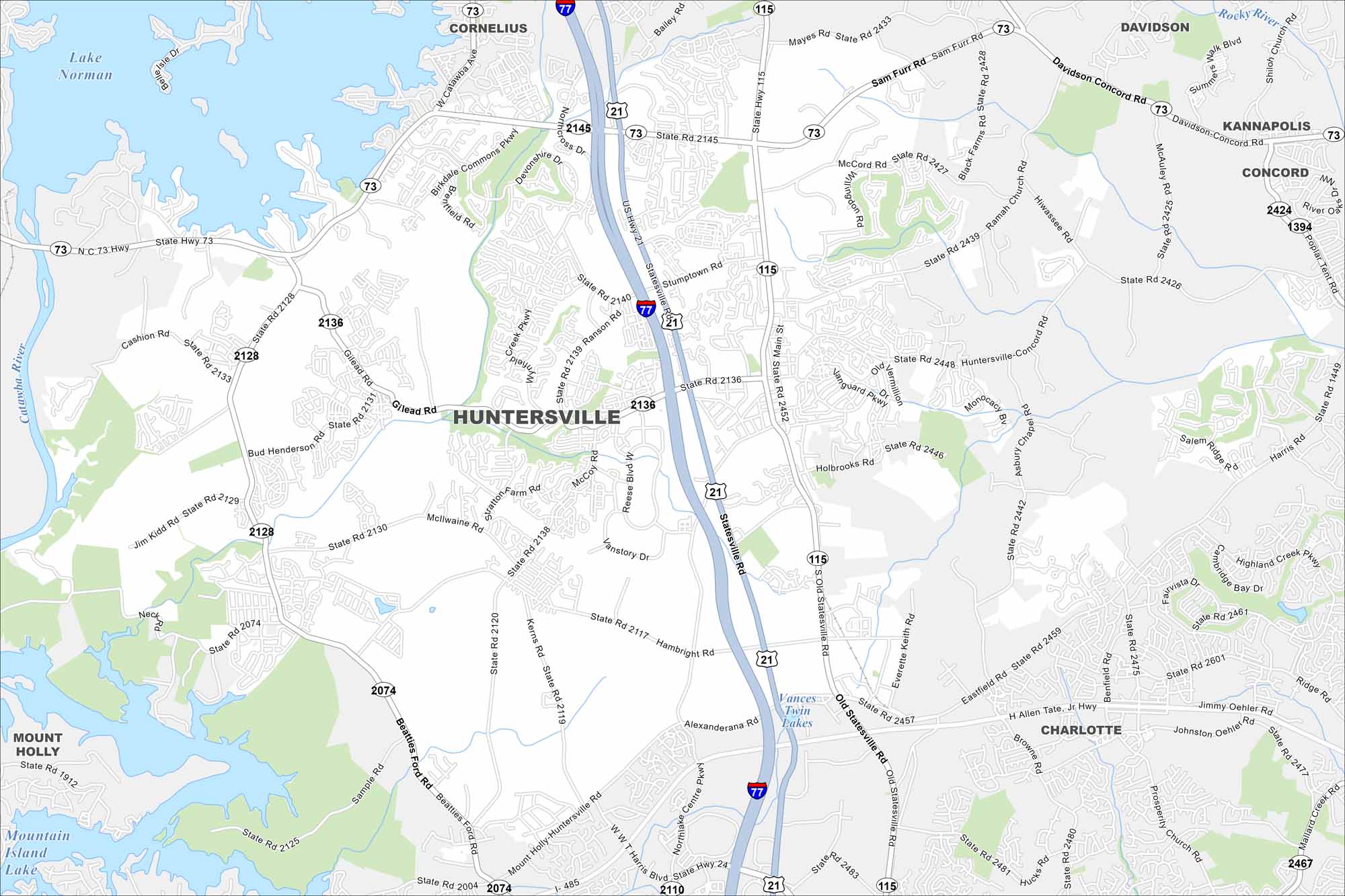 Our map of Huntersville highlights its prime spot just north of Charlotte. Lake Norman stretches out to the west. Suburban growth and green space balance the layout.