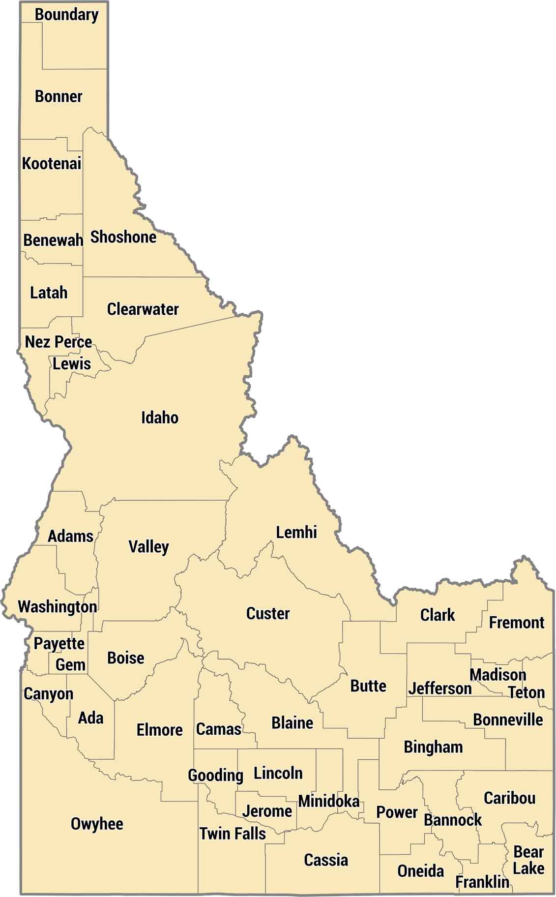 Idaho has 44 counties spread across mountains, plains, and canyons. Western counties tend to follow the Snake River. In the central mountainous areas, the lines often run along the crests of mountain ranges. The southern counties are along I-84 and hold most of the population in cities like Boise and Twin Falls.