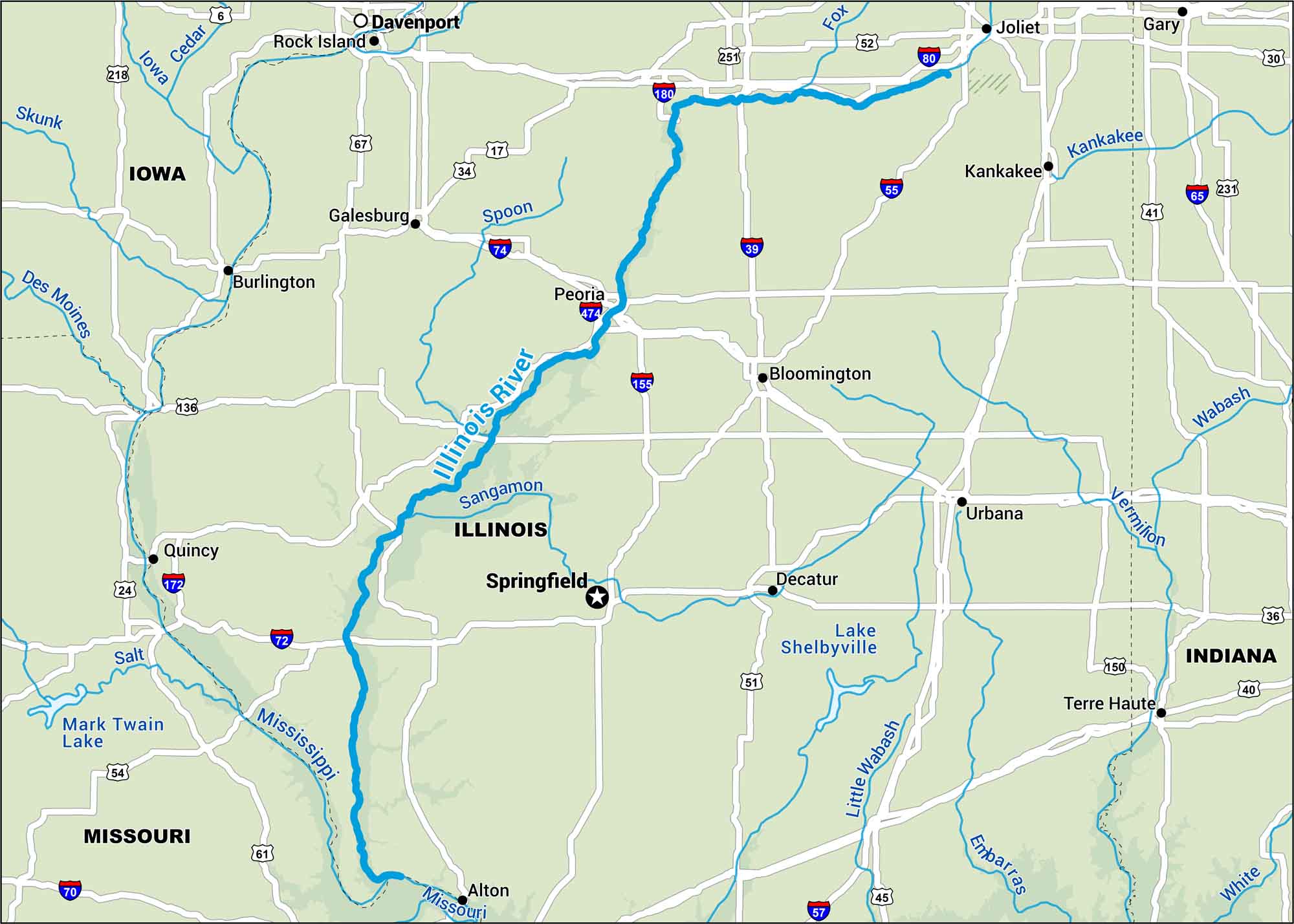 Cutting across the heart of Illinois, the Illinois River connects small towns and wide stretches of farmland. Find its path from the confluence with the Des Plaines all the way to the Mississippi.