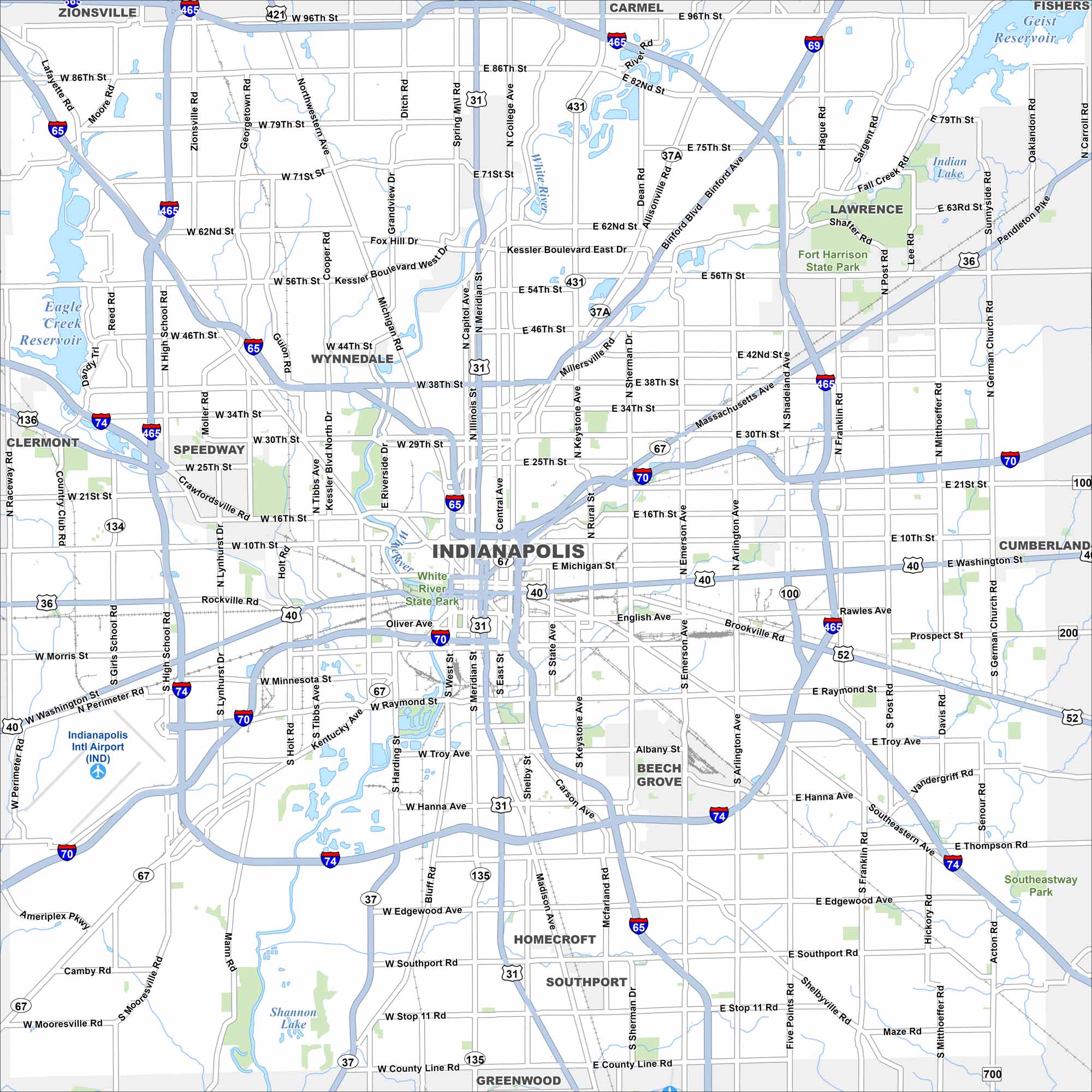 Check out our map of Indianapolis with its famous “Mile Square” downtown. Interstates form a ring around the city. The White River winds right through the middle with its own state park downtown.