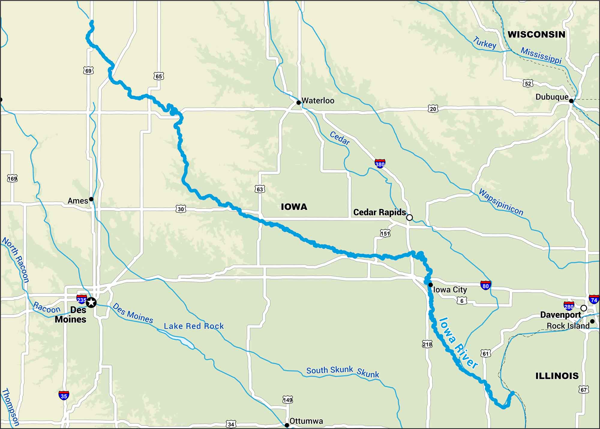The Iowa River runs straight through the center of the state, passing Iowa City on its way to the Mississippi. Our map shows its winding course and the roads that follow it through farm country.