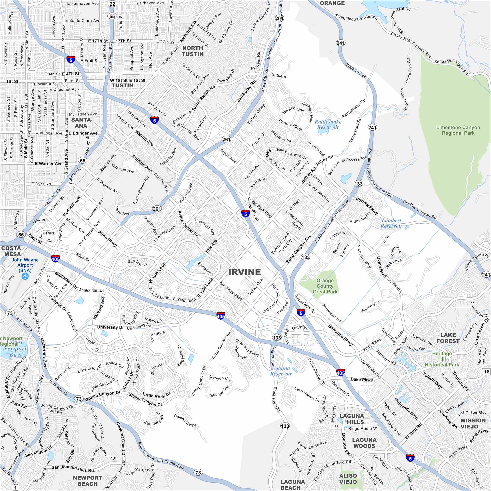 Explore our map of Irvine to see its master-planned neighborhoods. Freeways frame the city on every side. Parks, greenbelts, and university campuses stand out the most in this city.