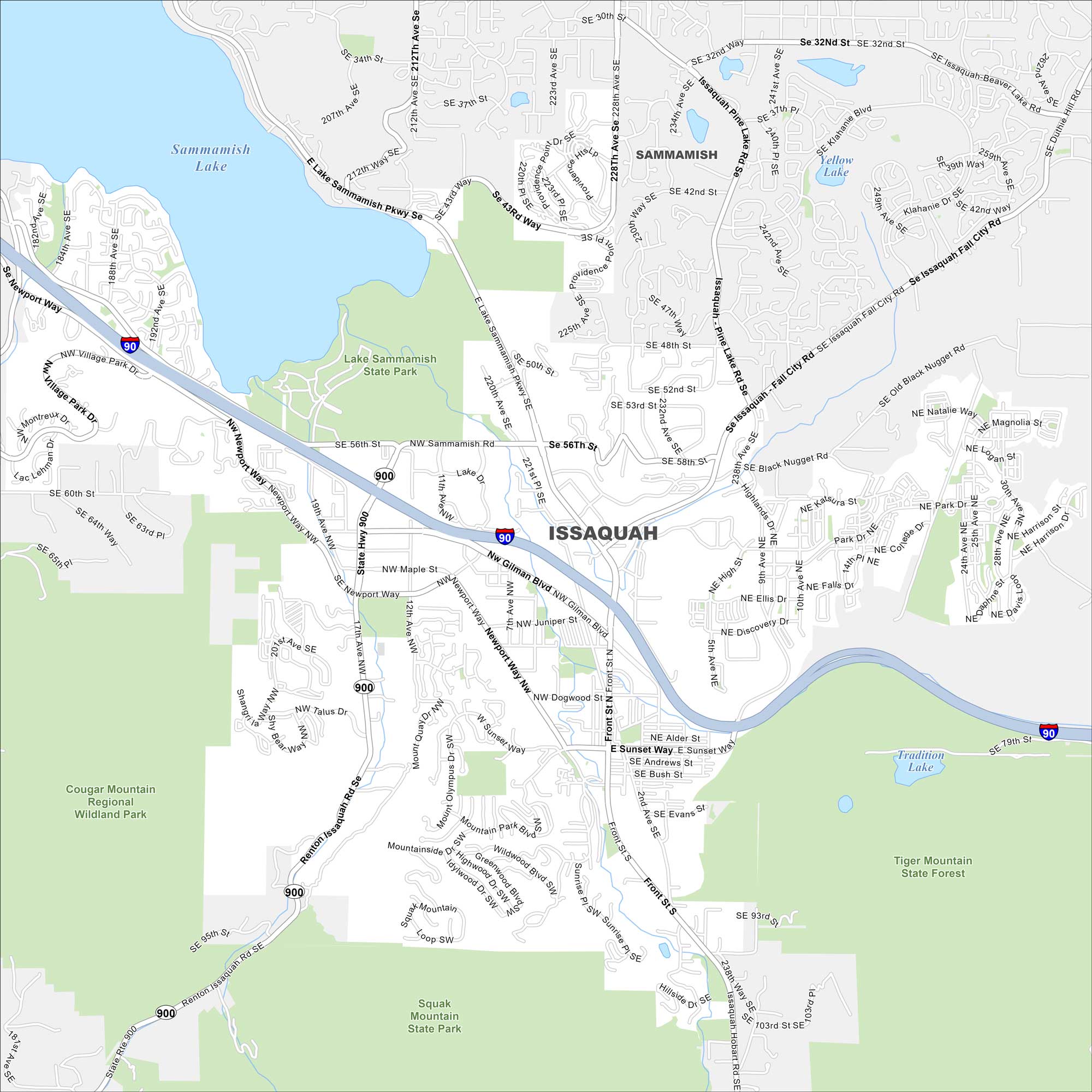 Issaquah sits at the base of the Cascade foothills with Lake Sammamish in the northwest. Our map shows I-90 cutting through the valley. Lakes and forested hills rise on both sides.