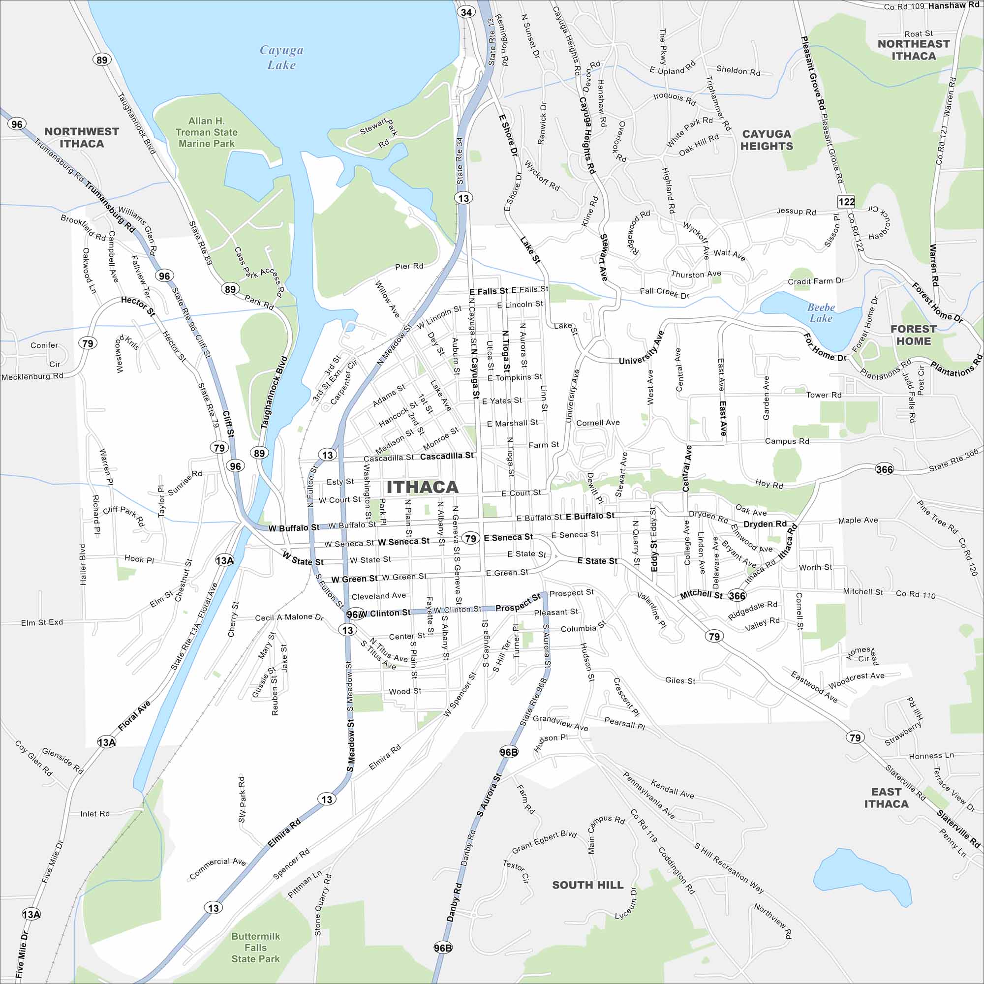 Check out our map of Ithaca on the southern tip of Cayuga Lake. Gorges and waterfalls cut through the city. Cornell University is also here across the hills.