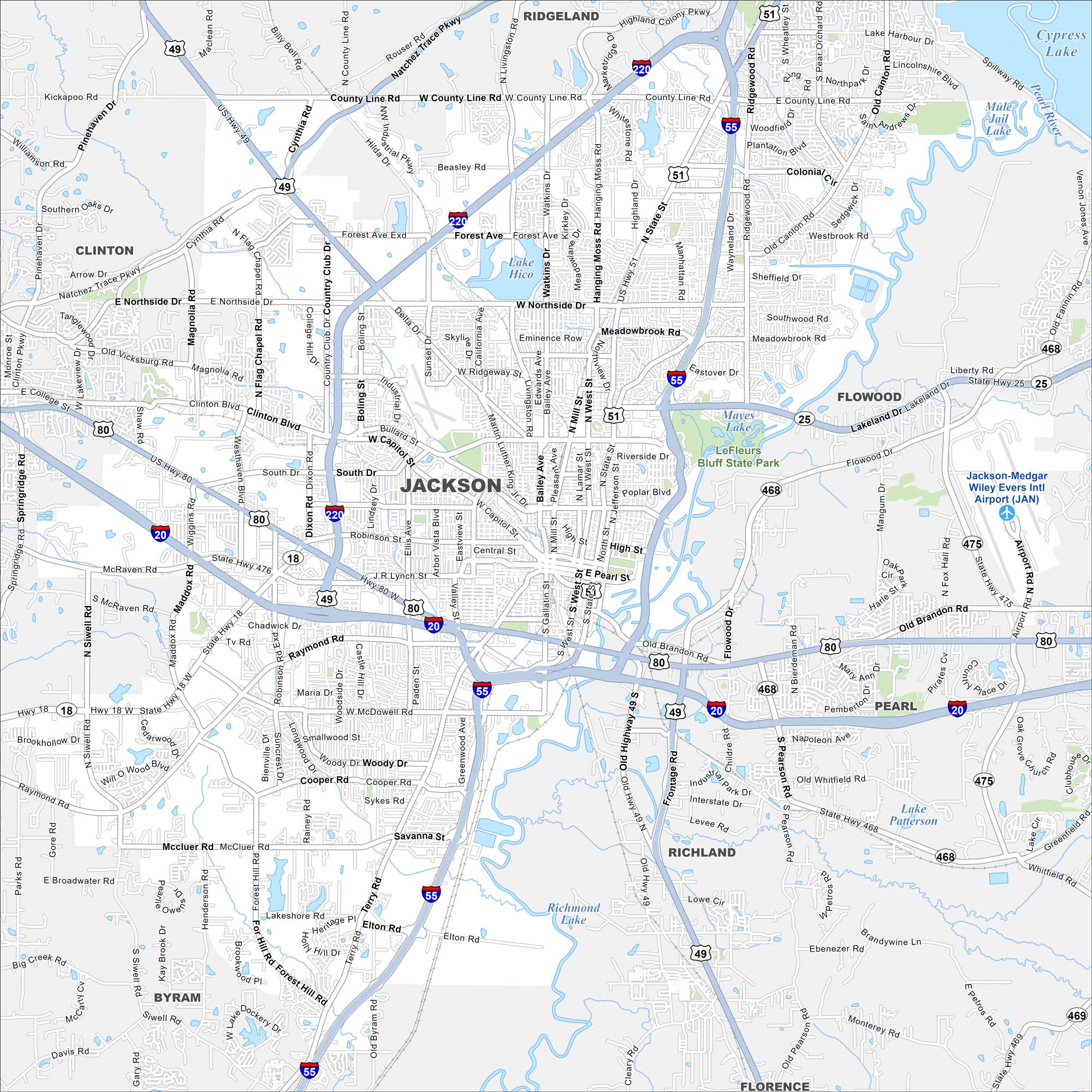 Jackson, Mississippi is centered on the Pearl River. Our map shows highways circling the city and its network of roads. State government buildings stand near the river.