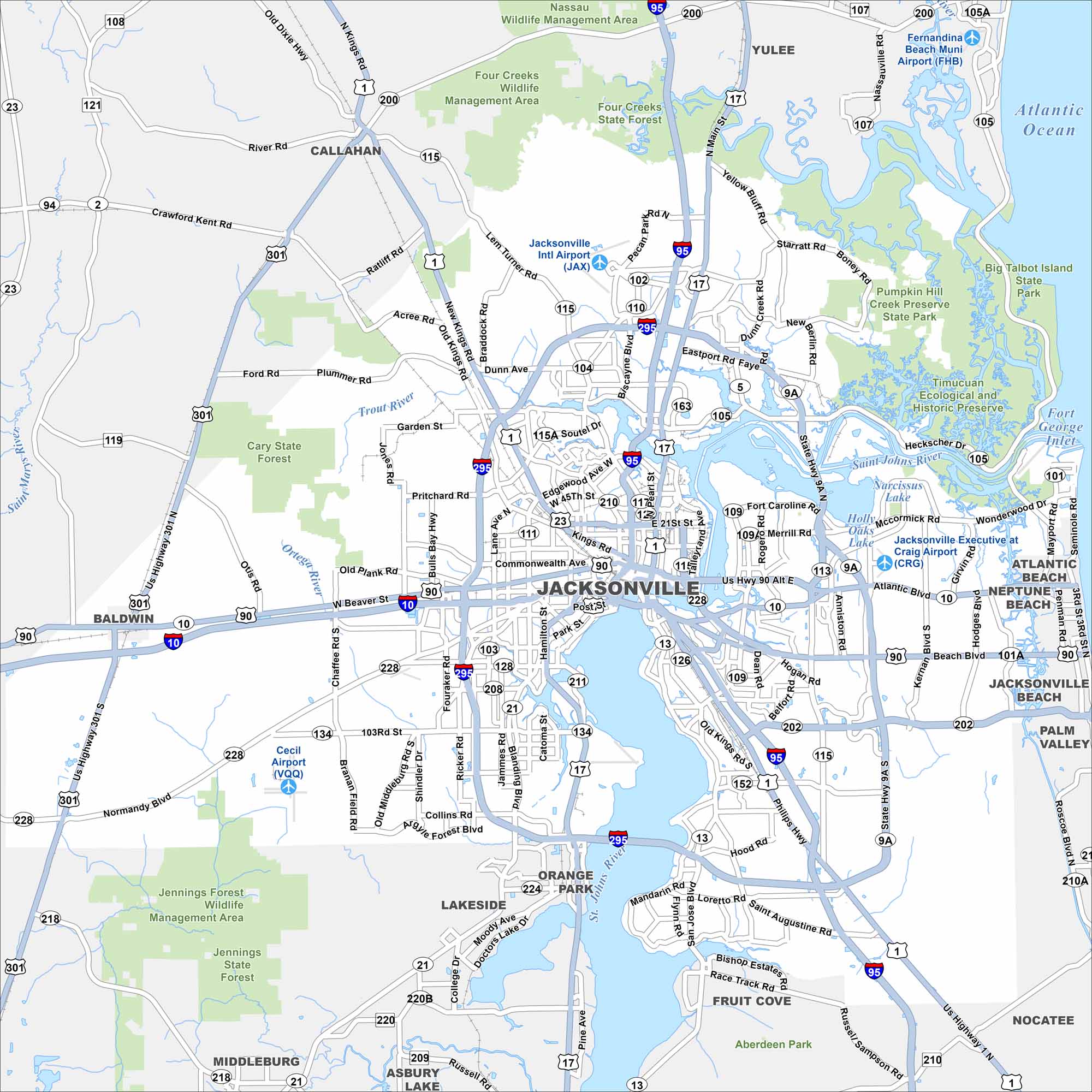 Jacksonville spreads along the St. Johns River. Check out the state parks and highways looping around the city. Beaches and suburbs extend to the east.