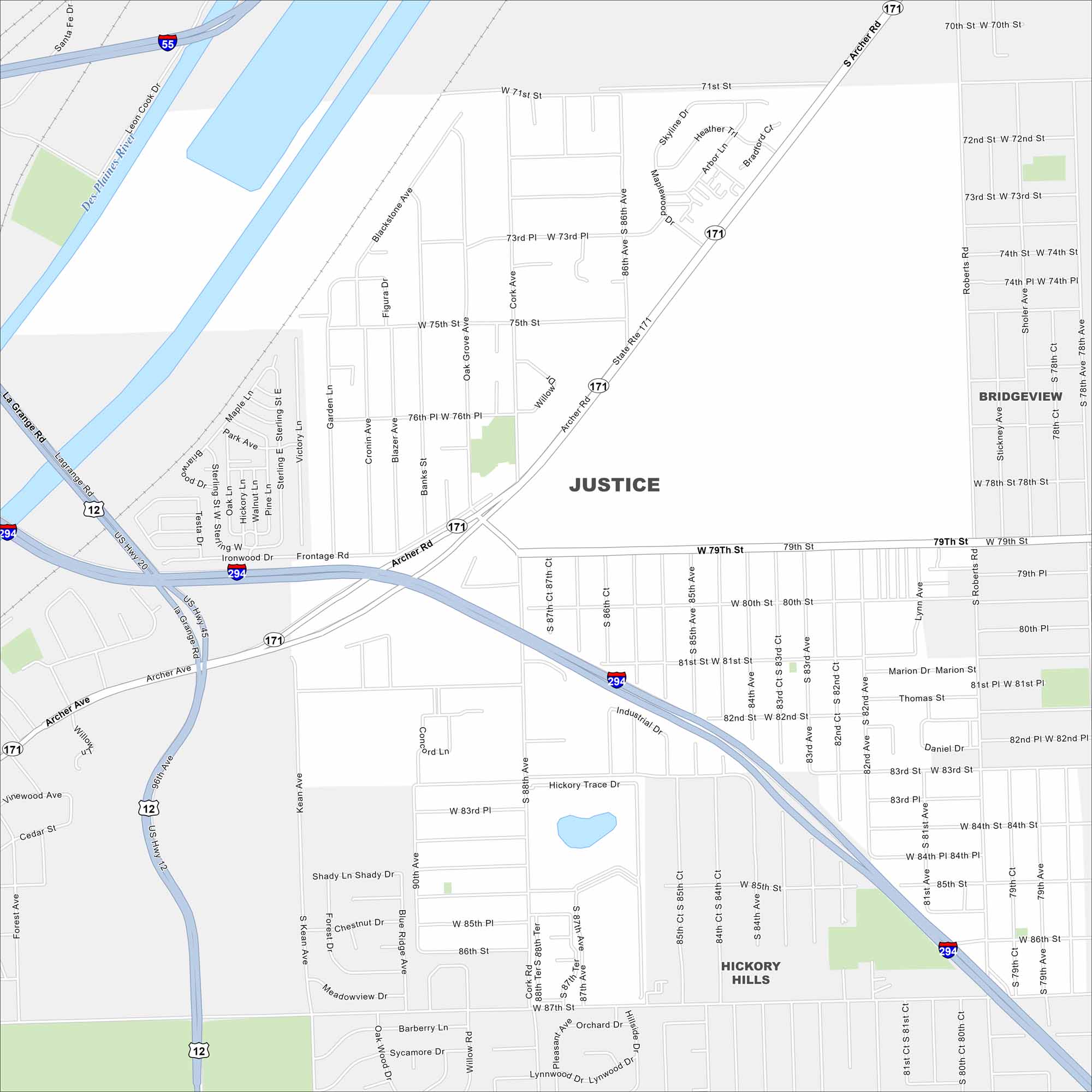 Justice is a compact suburb southwest of Chicago. Our map shows it pressed between two major interstates. Forest preserves surround parts of the village.