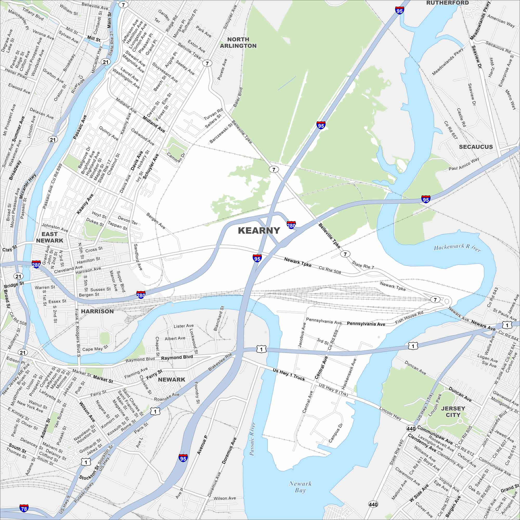 Kearny lies between the Passaic and Hackensack Rivers. Our map shows industry and neighborhoods side by side. Major highways link it directly to Newark and New York City.