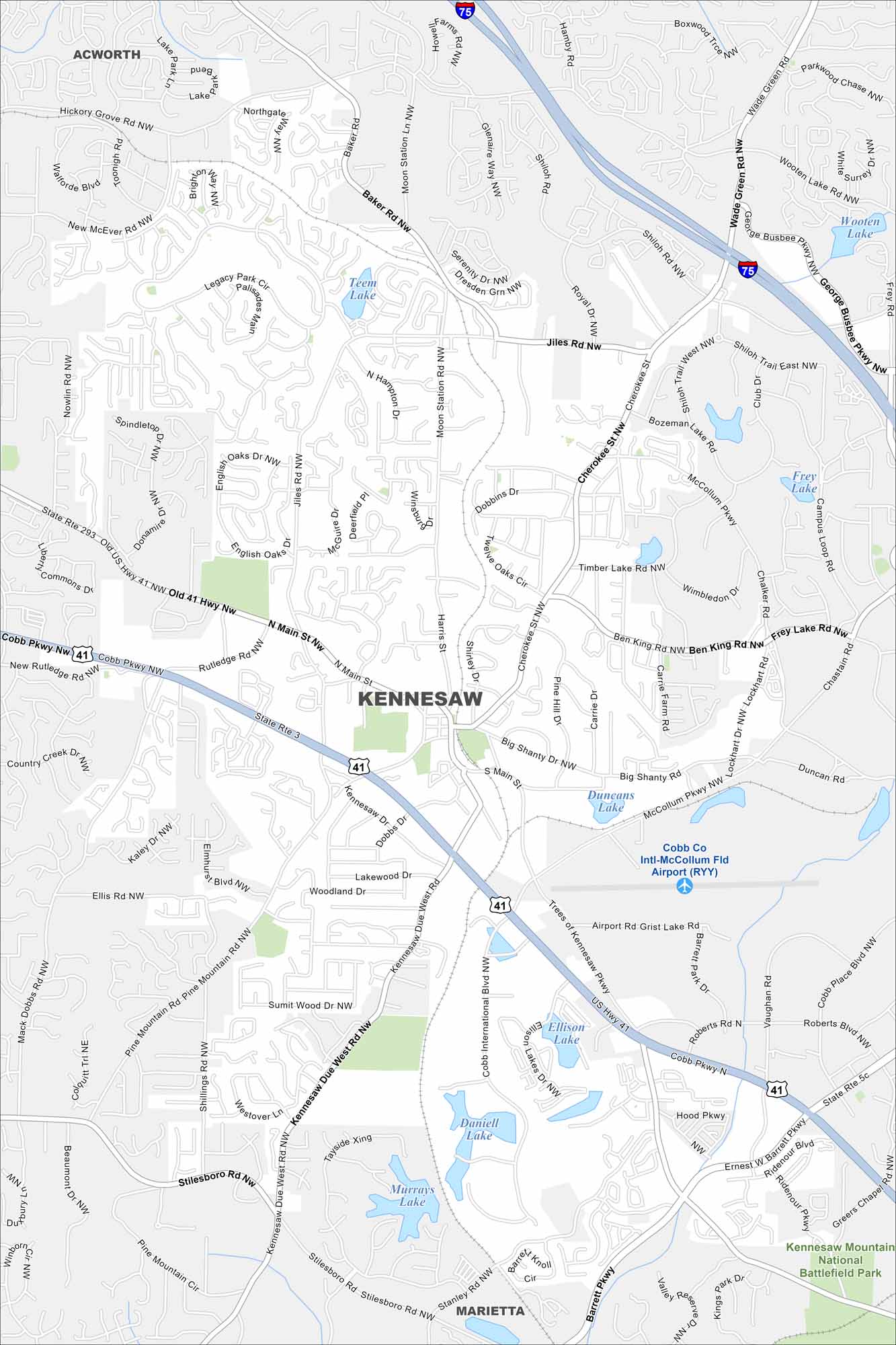 Kennesaw sits northwest of Atlanta. Our map shows Kennesaw Mountain National Battlefield Park on its edge with highways connecting it to the metro area.