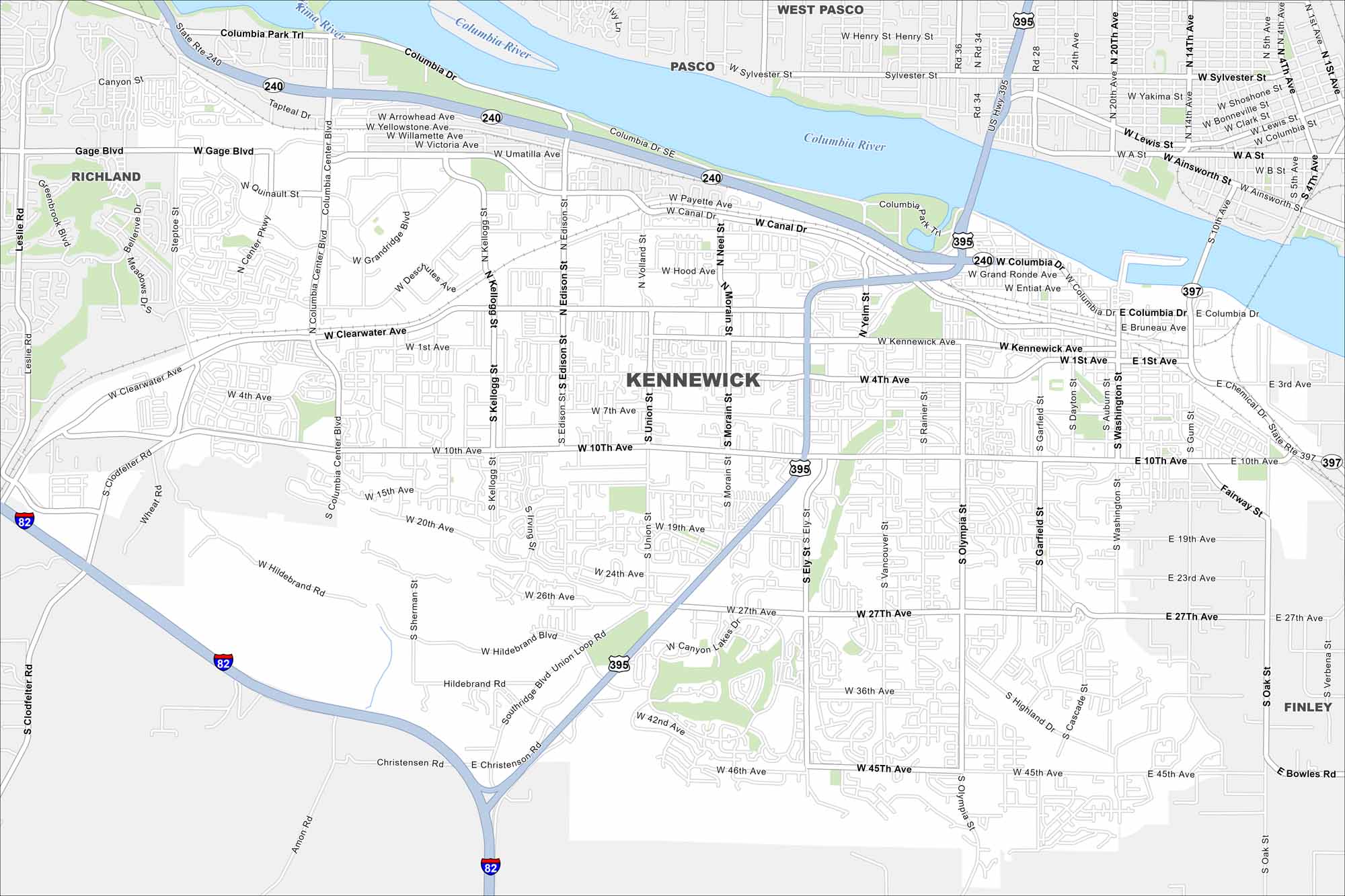 Our map of Kennewick shows its location on the Columbia River. Bridges link it with Pasco and Richland. Farmland spread out to the south.