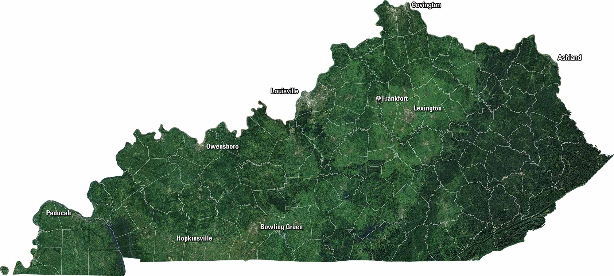 Our satellite map of Kentucky displays its rolling hills, green valleys, and long stretches of forest. Coal country lies to the east, while horse farms spread wide in the Bluegrass region. Louisville and Lexington stand out among the winding rivers and farmland.