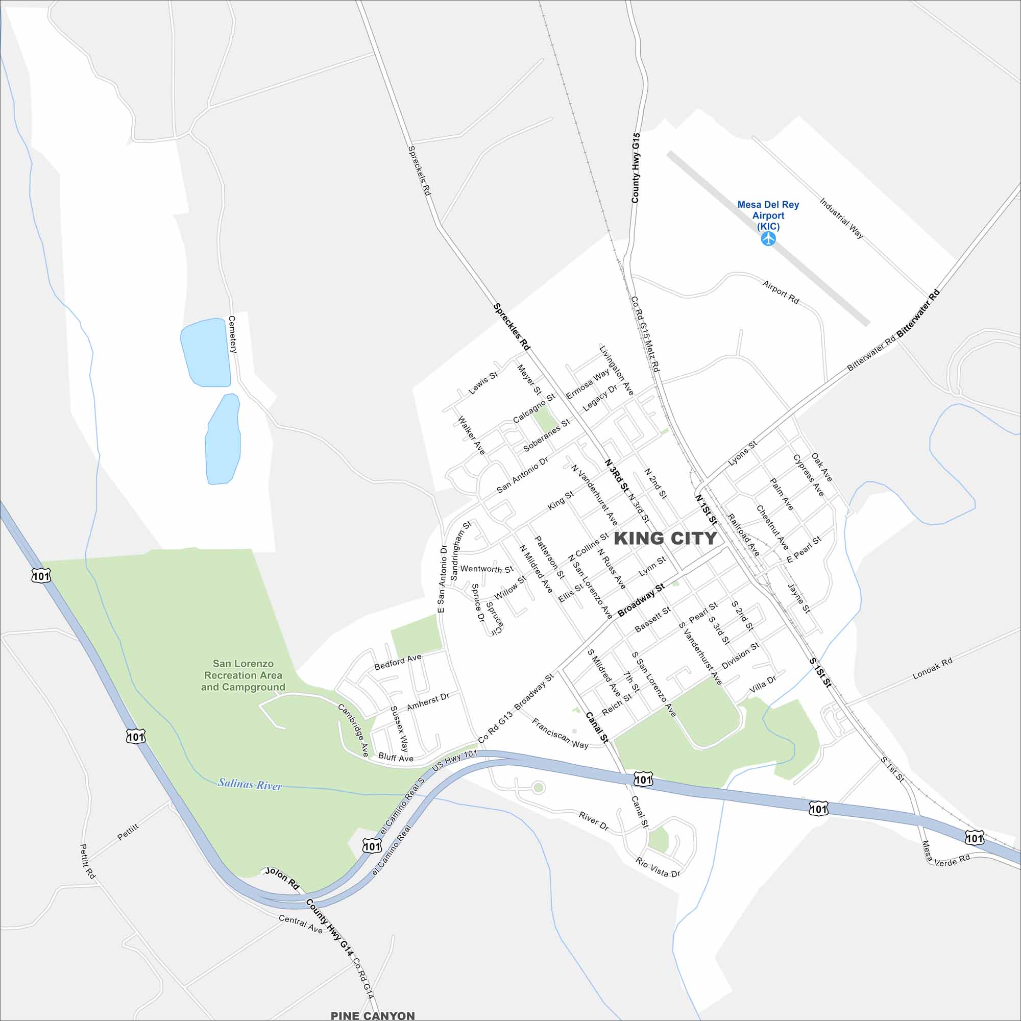 Our map of King City shows it tucked in the Salinas Valley. Vineyards and farmland stretch in every direction. The Salinas River flows just west of the city.