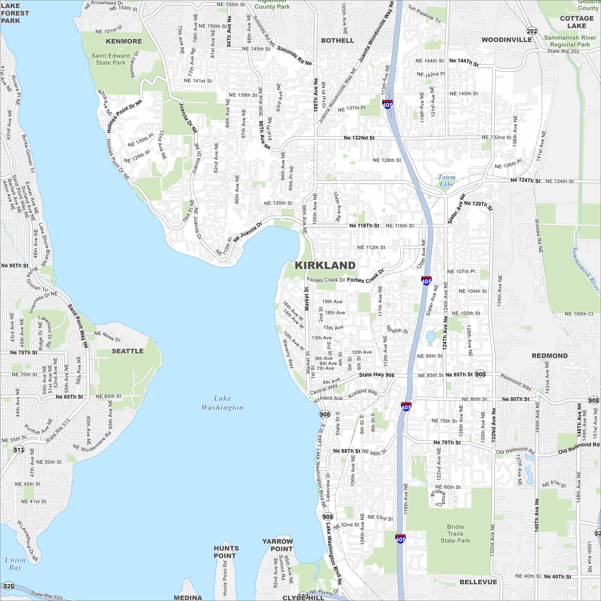Kirkland is right on the shore of Lake Washington. Our map highlights highways, roads, and parks. Seattle sits just across the water.