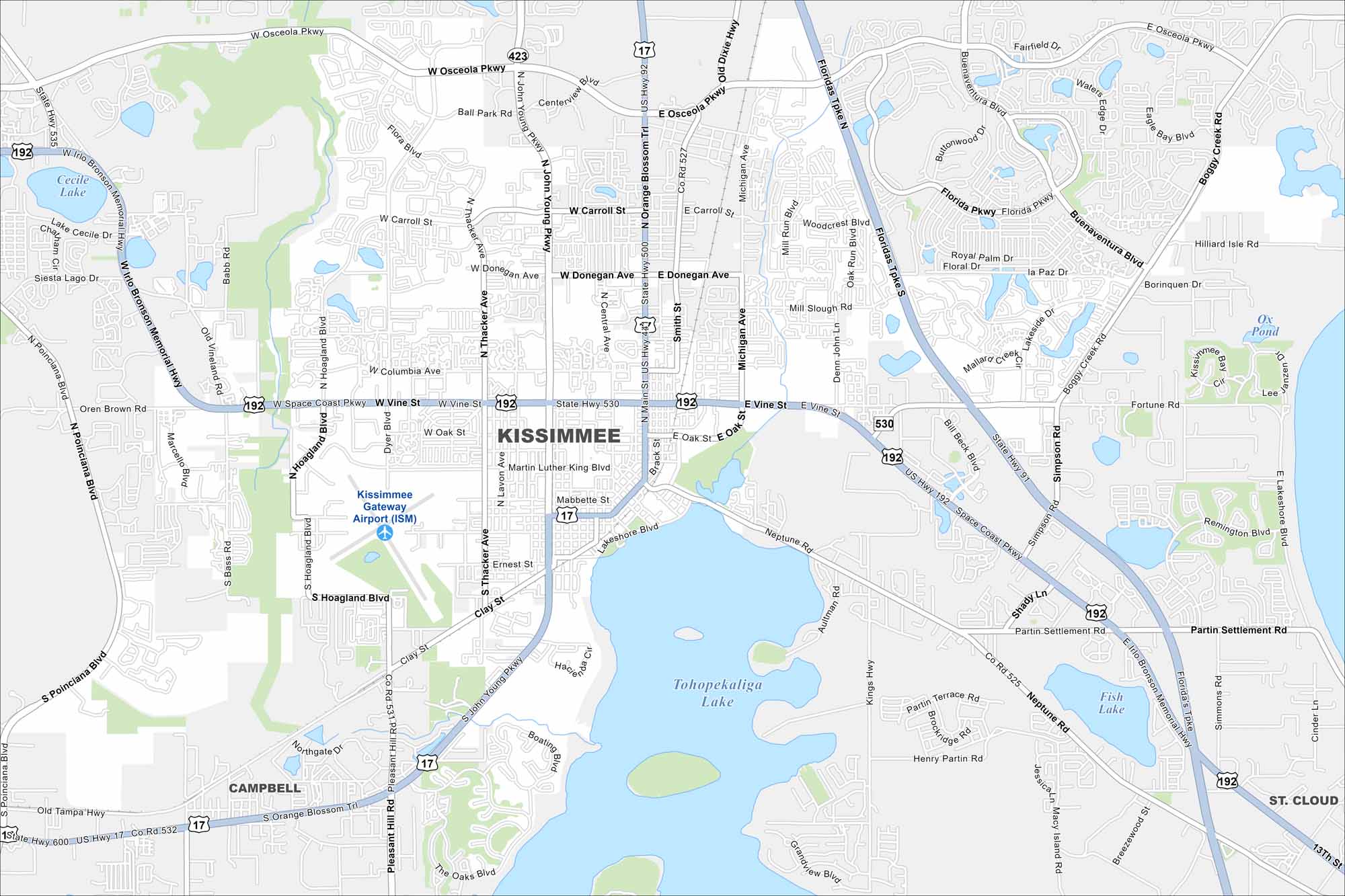 Kissimmee lies just south of Orlando. Our map shows lakes across the landscape and roads leading toward Disney parks. The city spreads along the shore of Lake Tohopekaliga.
