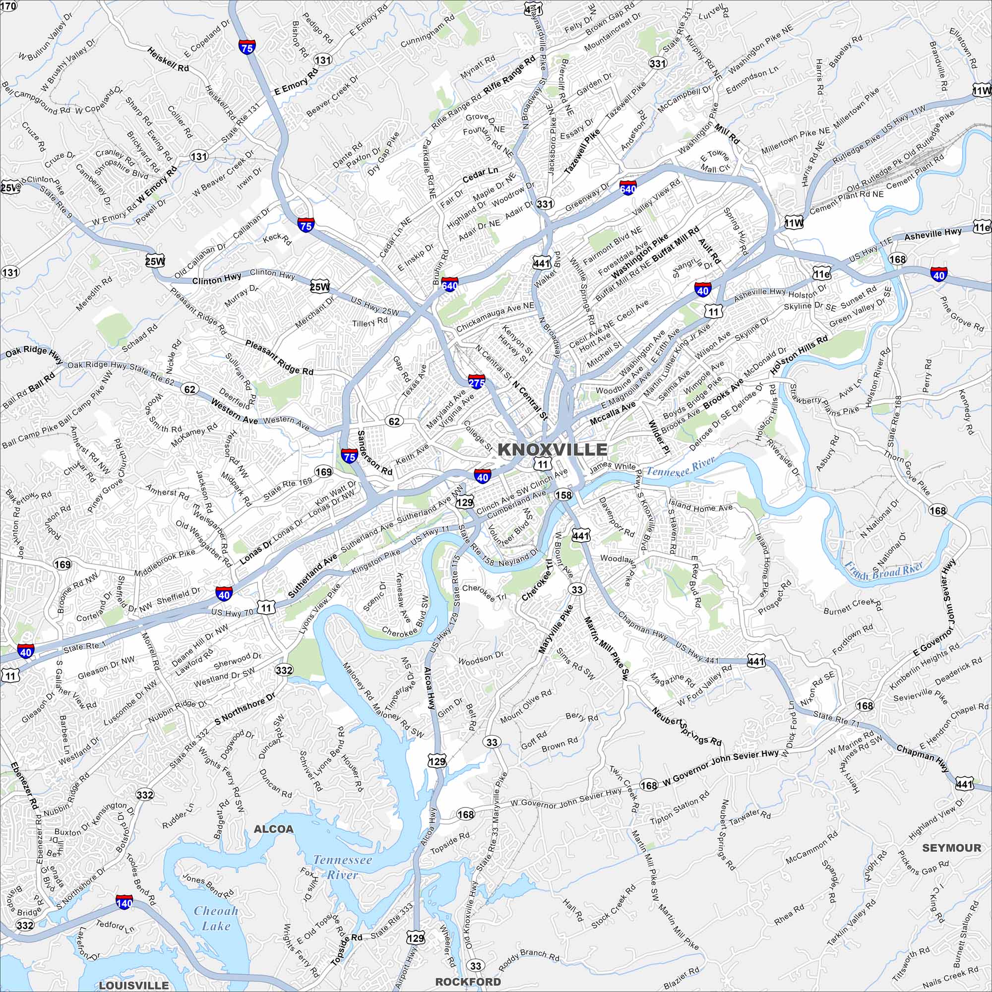 Check out our map of Knoxville with Tennessee River as a key feature. Downtown sits near the river’s bend. The Great Smoky Mountains loom to the southeast.