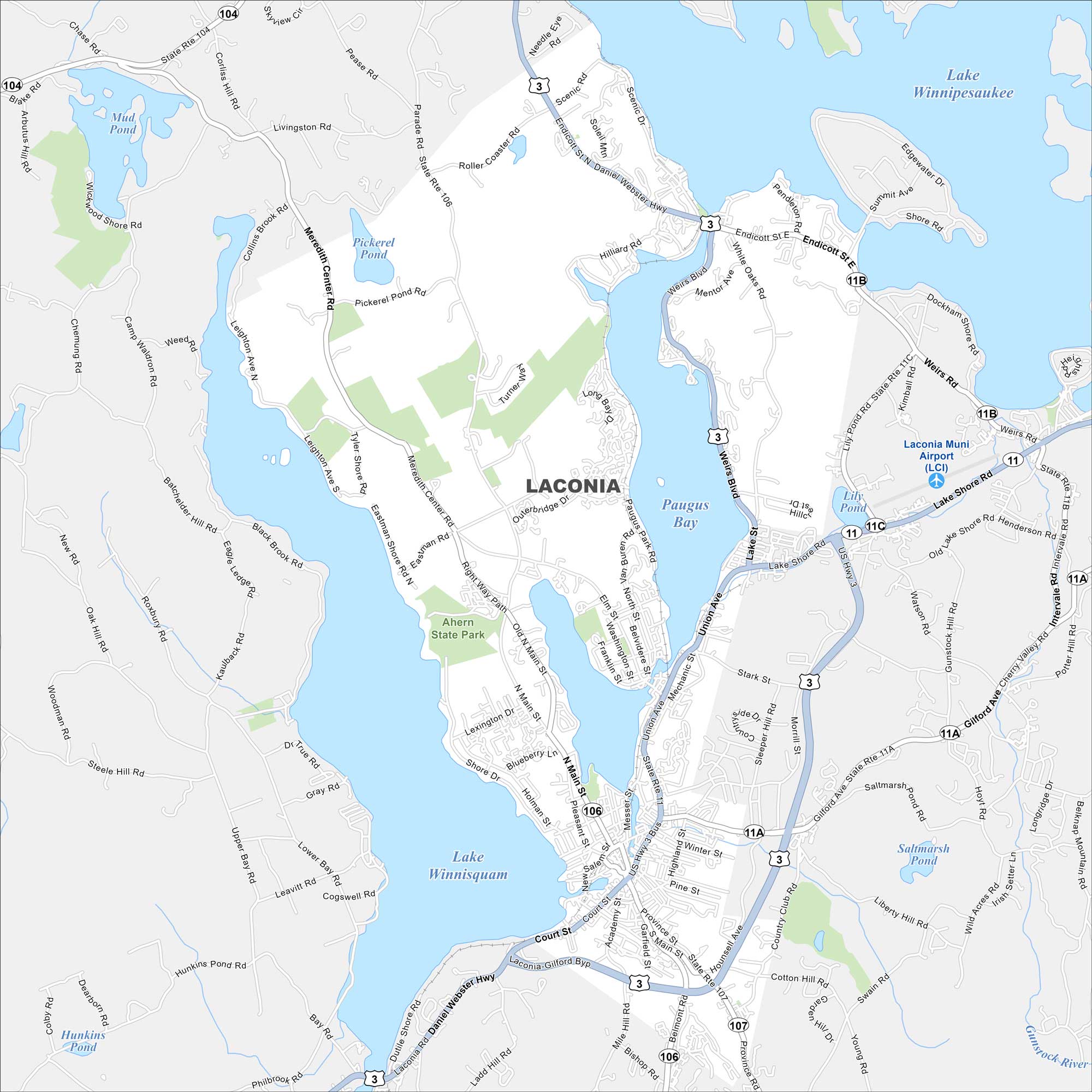 Laconia is located between Lake Winnipesaukee and Lake Winnisquam. Downtown streets cluster near the water. Highways stretch out to surrounding towns.