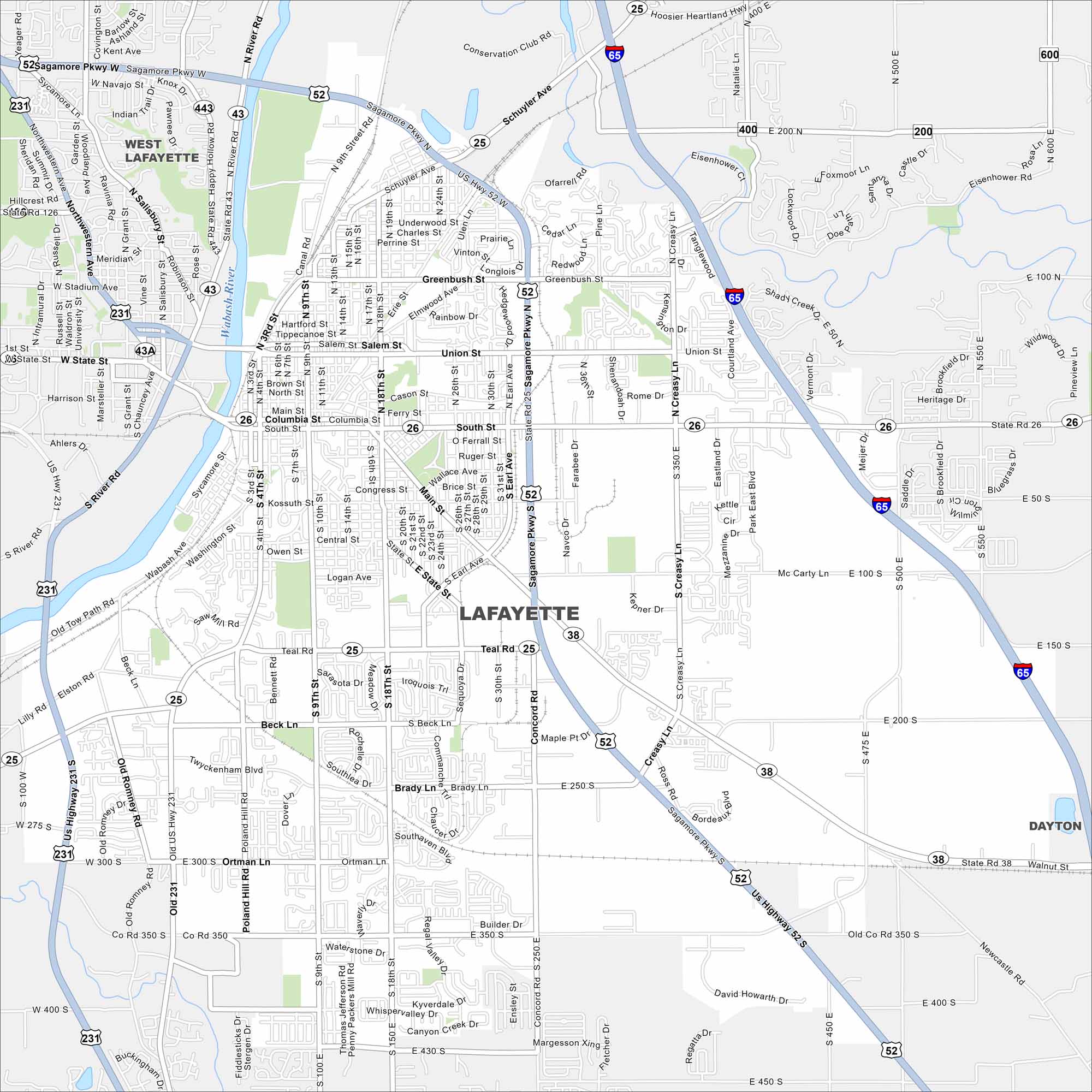 Our map of Lafayette shows the Wabash River cutting through downtown. Streets form a neat grid around the city center with Purdue University just across the river.