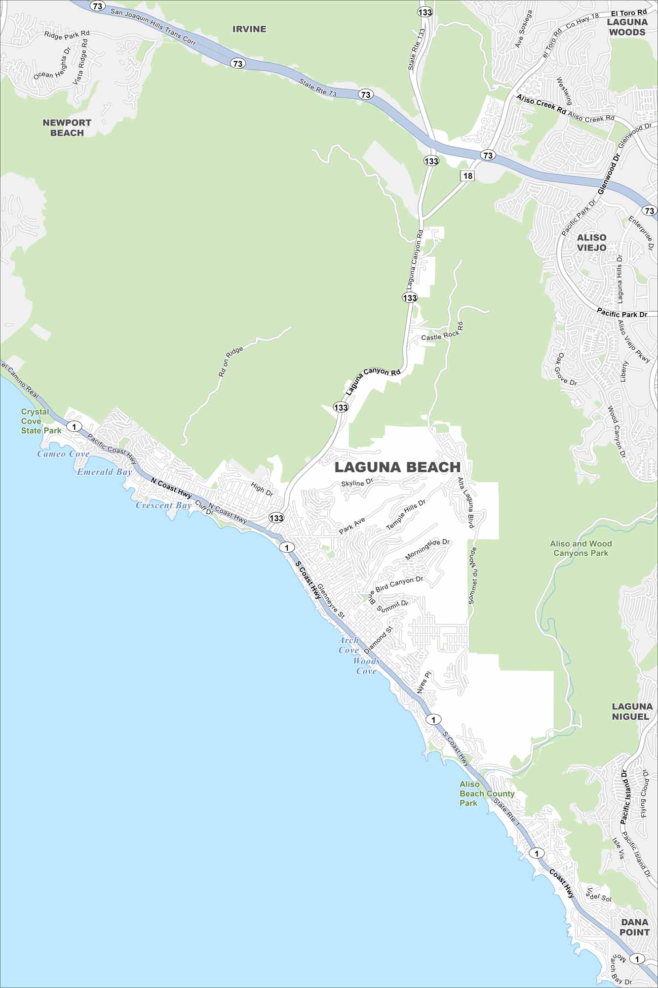 Our map of Laguna Beach follows the coastline of the Pacific Ocean. Canyons carve through the city, making winding streets. Beaches line the oceanfront.