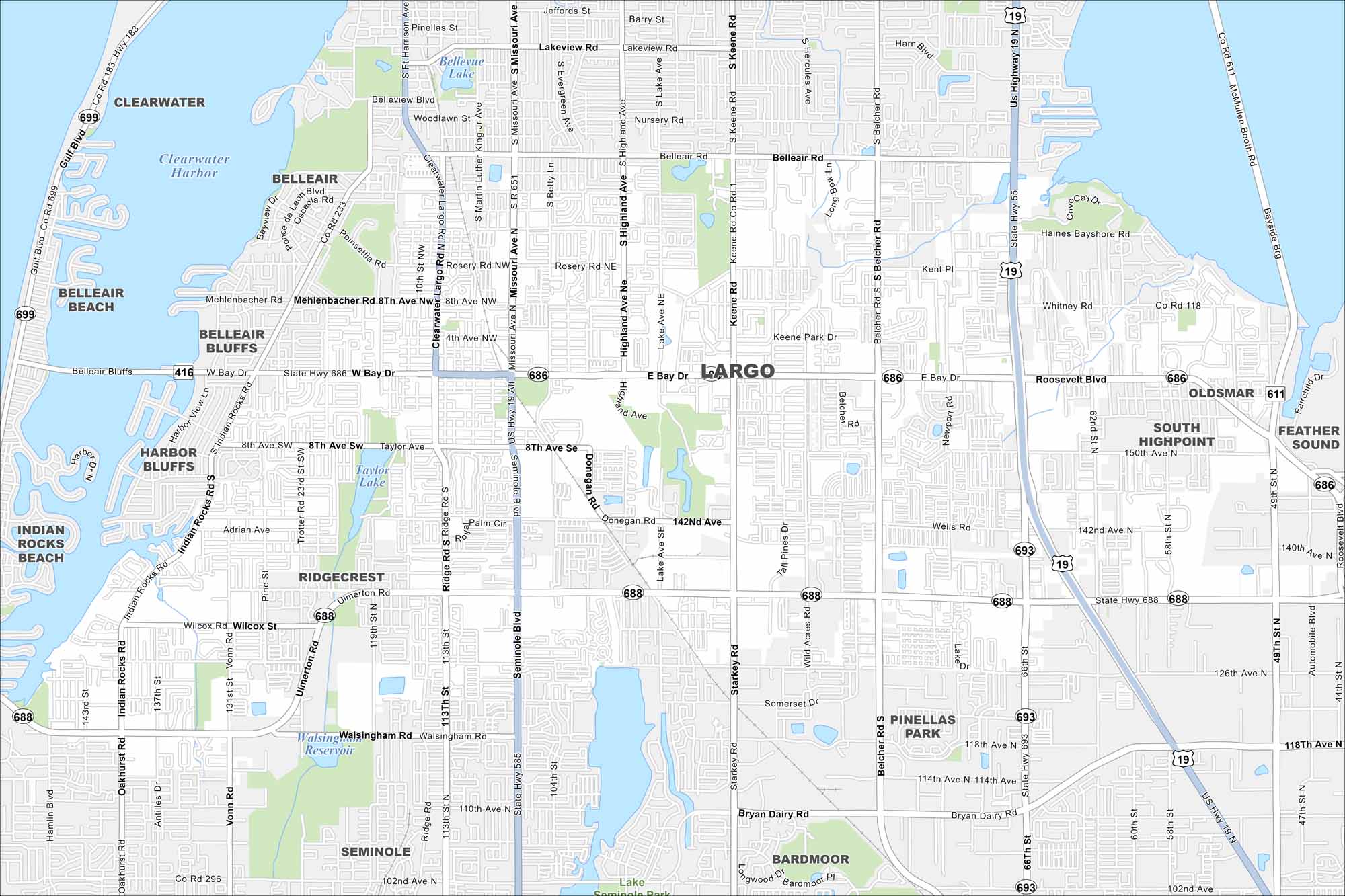 Largo appears in the heart of Pinellas County. This map shows it squeezed between Clearwater and St. Petersburg. Lakes and green parks cover the cityscape.
