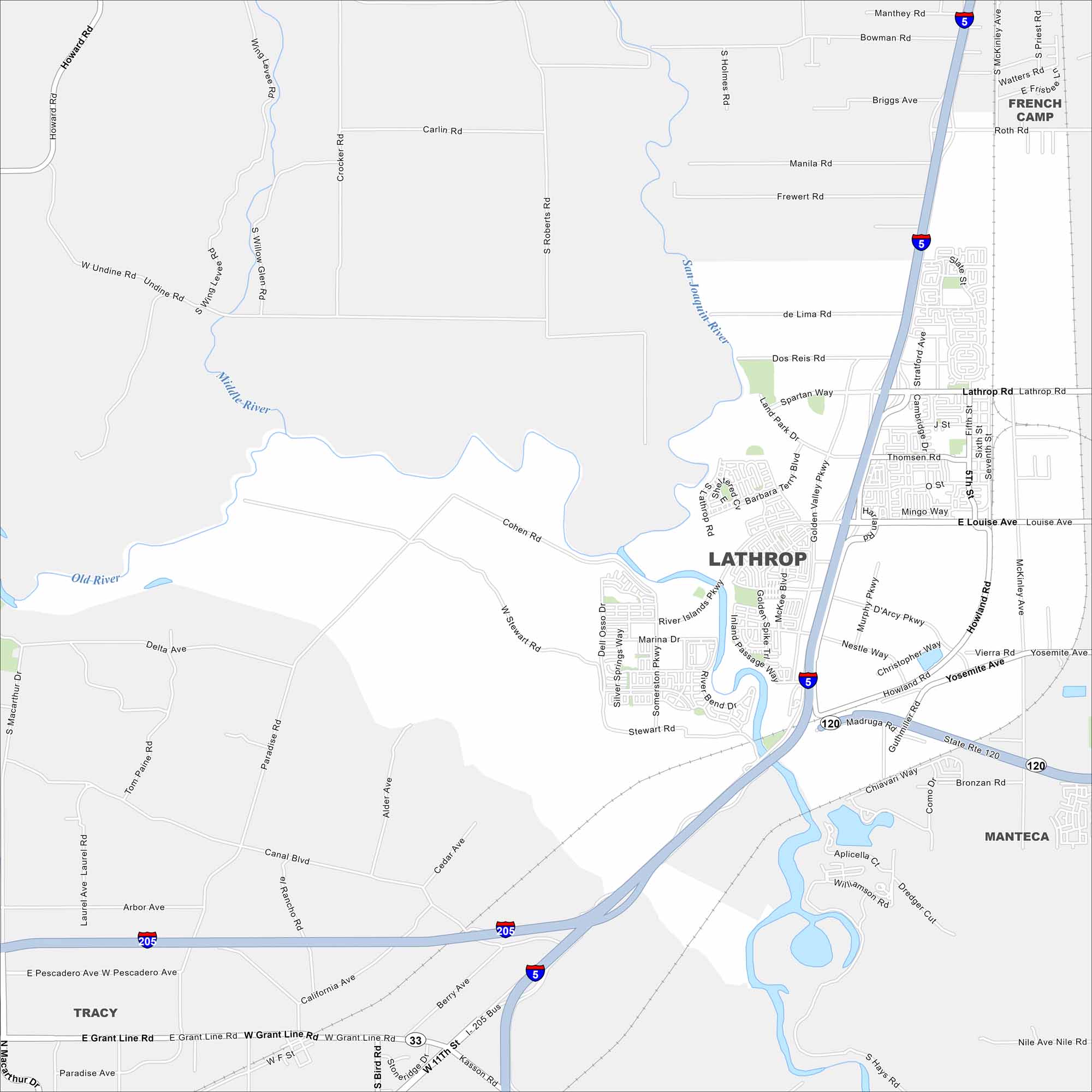 Lathrop sits at the junction of the San Joaquin River and Delta waterways. Subdivisions and warehouses dominate the map. Open farmland surrounds its edges.