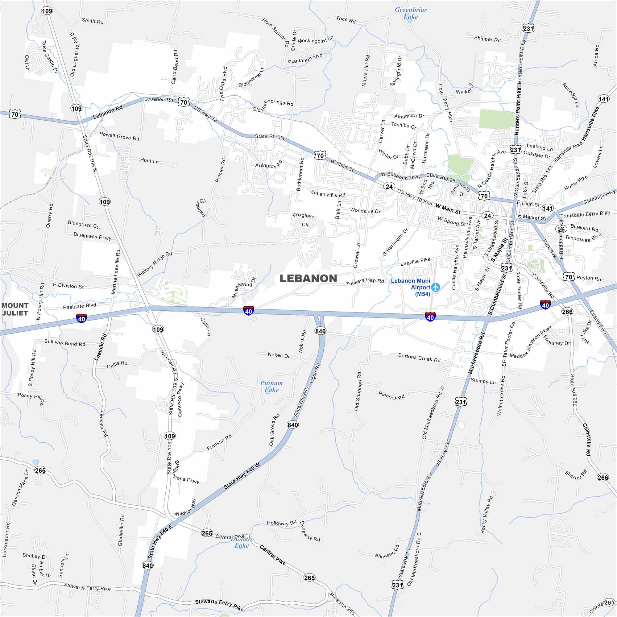 Lebanon sits east of Nashville, Tennessee. Our map displays its town square and street layout. The Cumberland River lies just beyond to the north.
