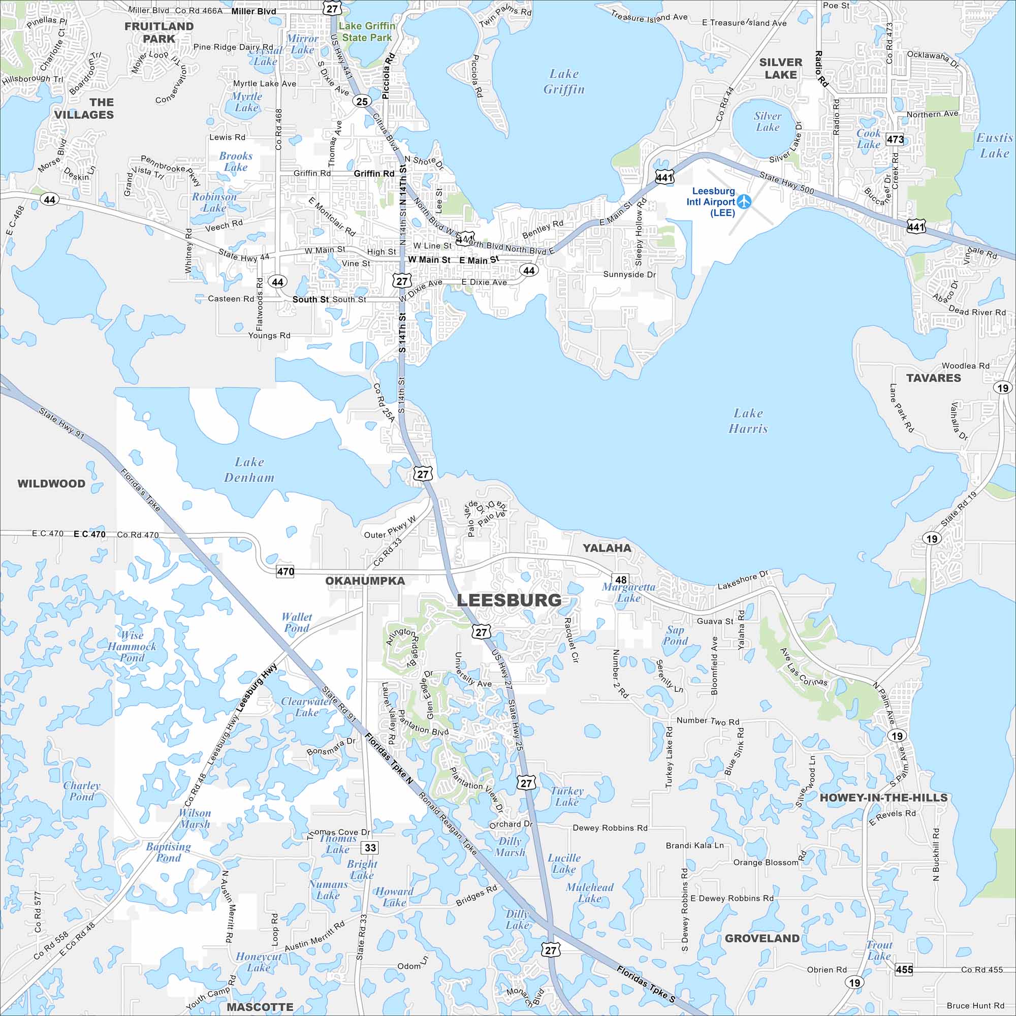 Our map shows Leesburg, Florida which stands between Lake Harris and Lake Griffin. Downtown streets cluster near the shoreline. Water defines its edges and city altogether.