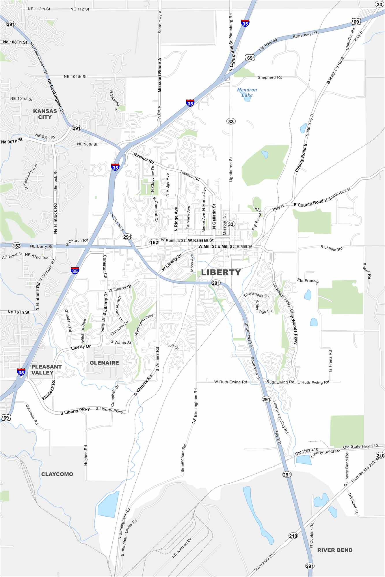 Liberty lies just northeast of Kansas City. The map shows its streets at the center. Surrounding it, neighborhoods fan outward into open land.