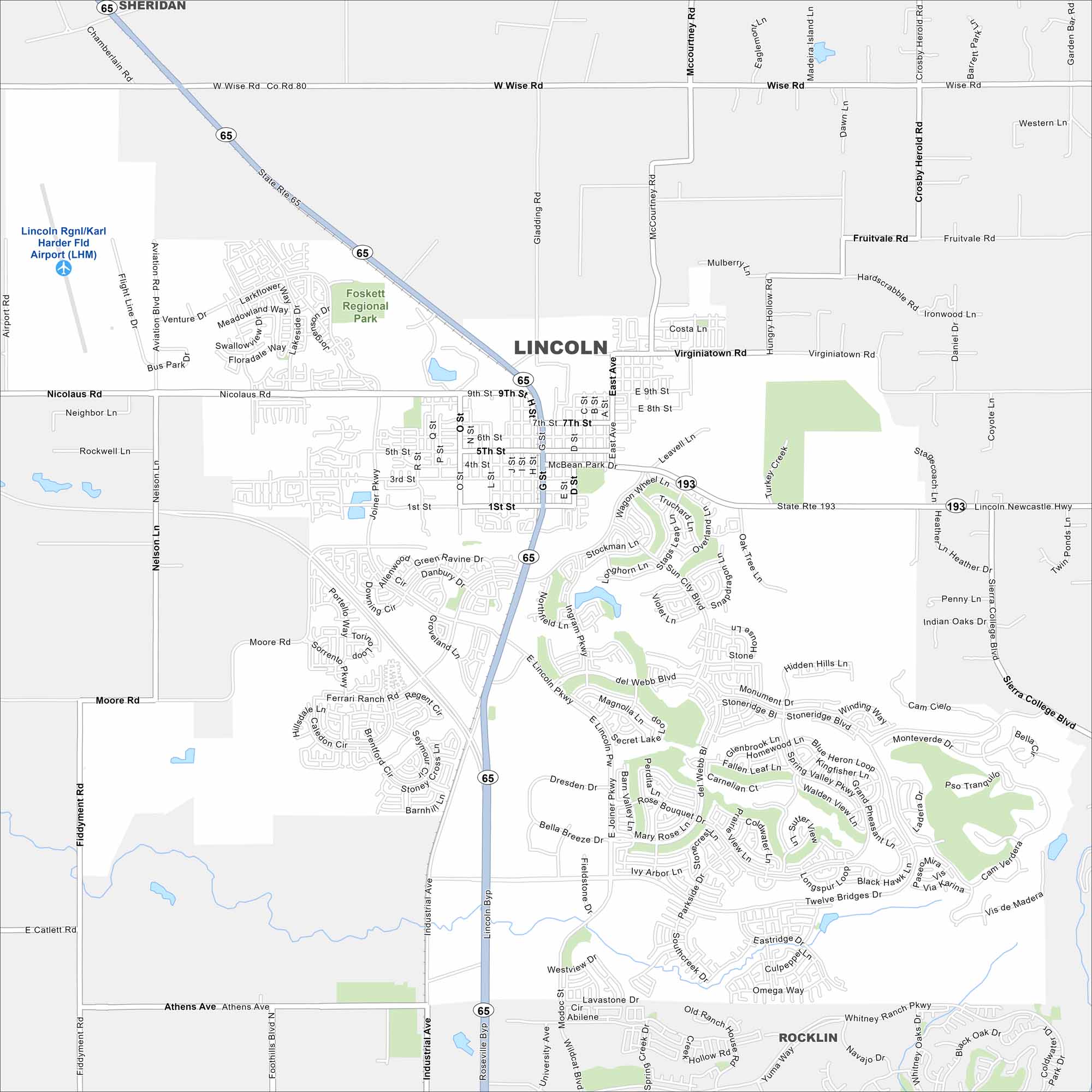 Lincoln shows up on the map at the edge of the Sierra Nevada foothills. The city blends new neighborhoods with older streets. Open fields mostly frame its outskirts.