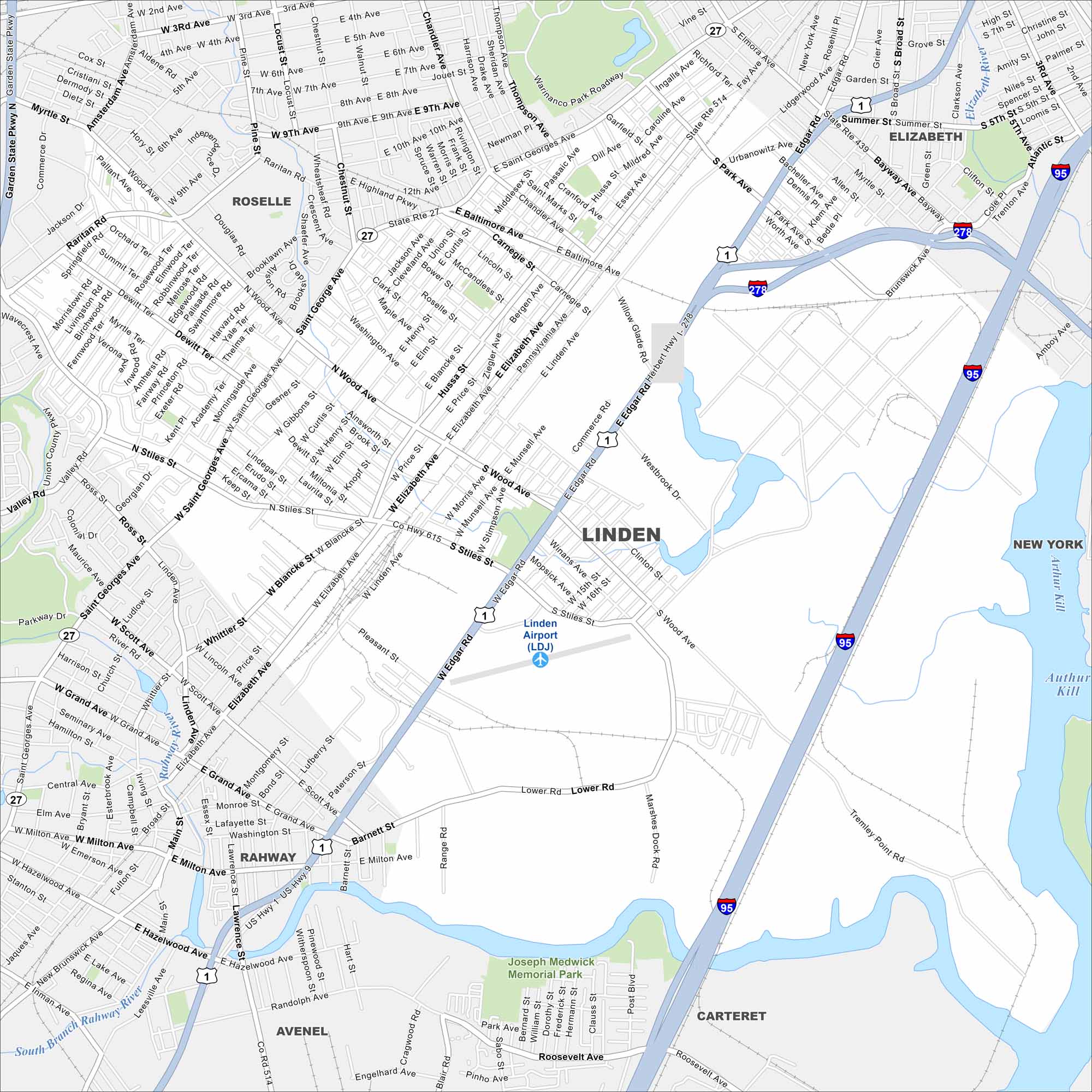 Our map of Linden highlights its mix of industry and neighborhoods. The city sits near Newark Bay with rail lines cutting across it. Refineries and shipping routes mark its landscape.