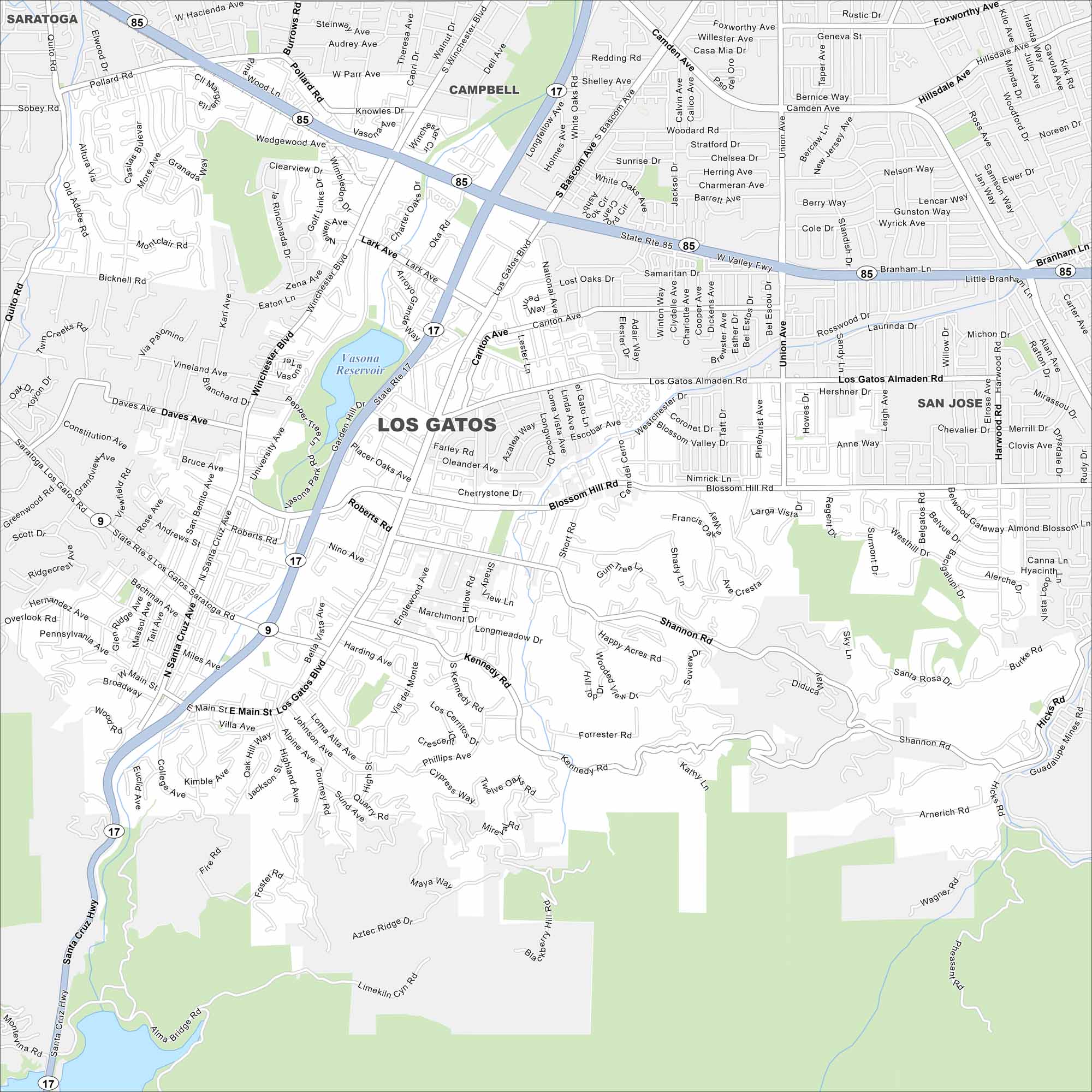 Explore Los Gatos at the foothills of the Santa Cruz Mountains. Our map shows winding streets heading into the hills. Highways connect it to San Jose and the coast.