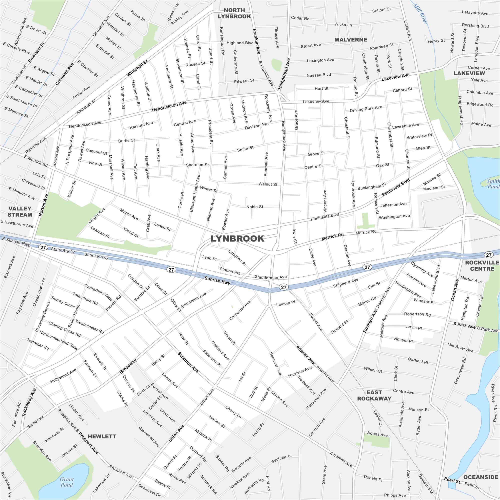 Lynbrook lies on Long Island just east of Queens. Our map shows the commuter roads, waterways, parks and rail lines. The Sunrise Highway ties it into greater New York City.