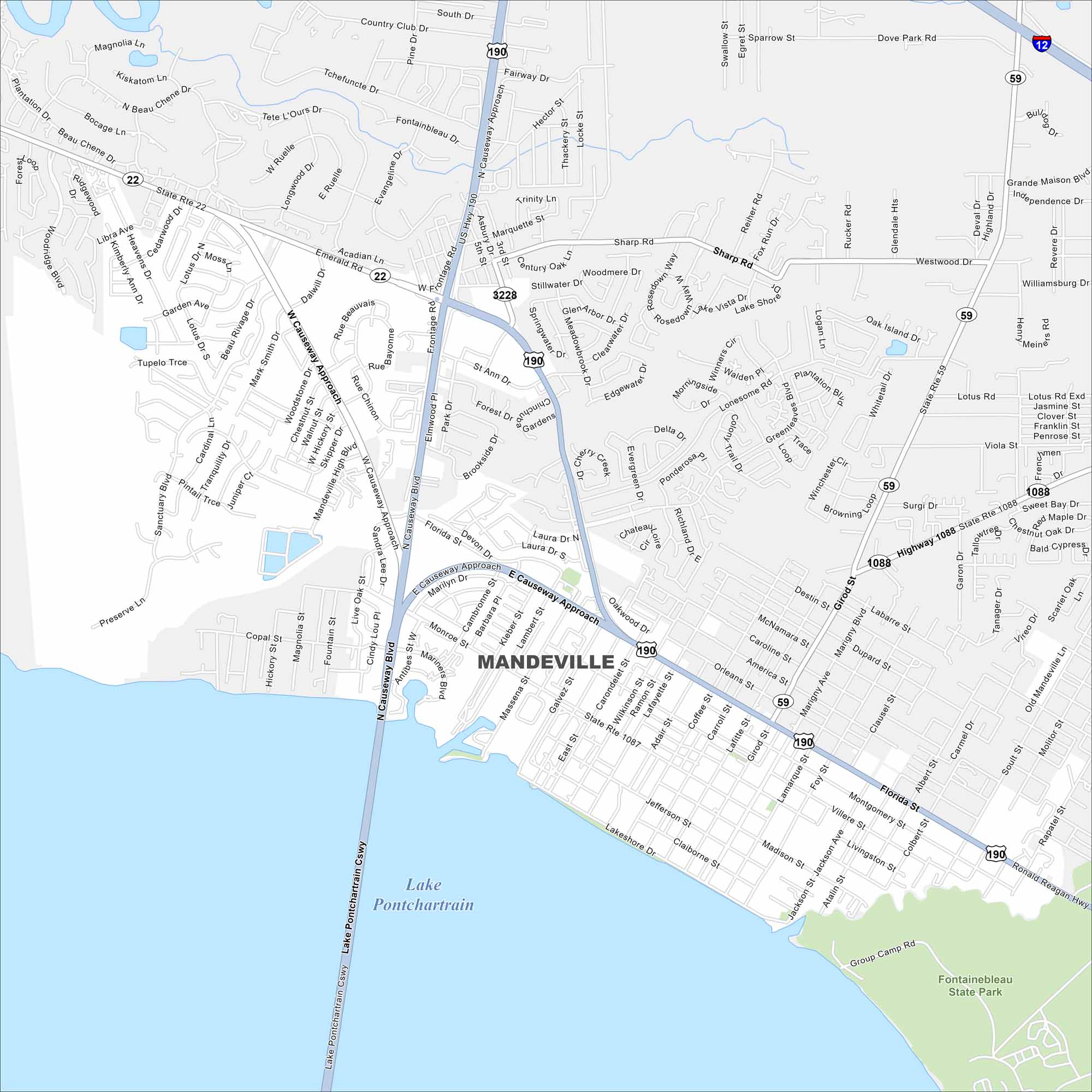 Take a look at Mandeville on the north shore of Lake Pontchartrain. Our map shows its highways curving toward New Orleans. Waterfront neighborhoods frame the city.