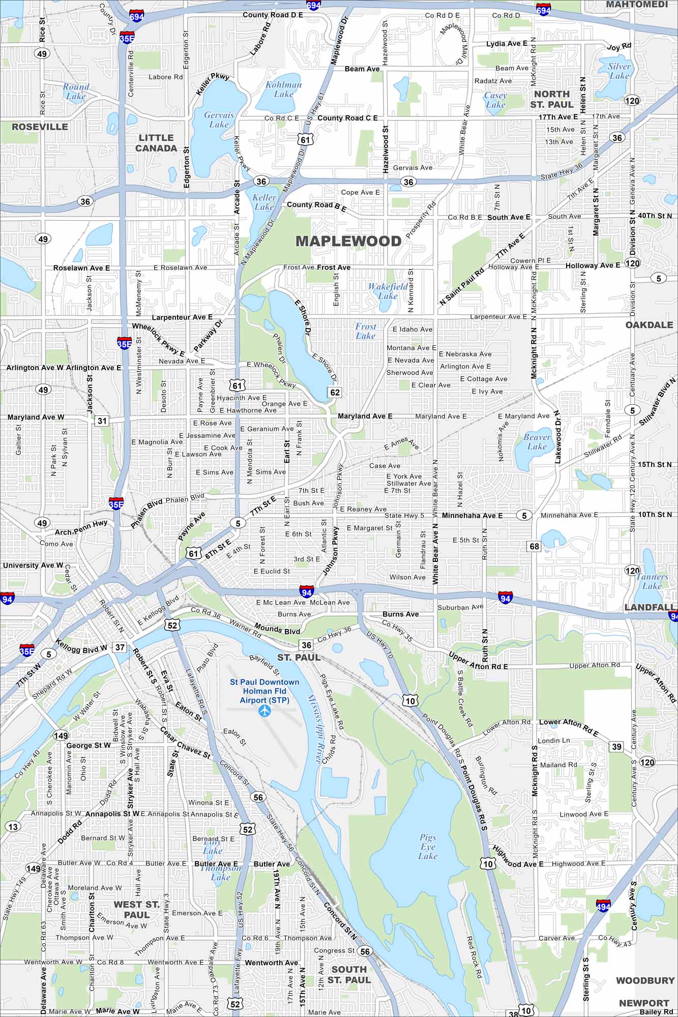 Explore Maplewood with our map. Highways form key routes around its neighborhoods and parks. Lakes and green spaces are scattered around the city. It sits right next to St. Paul, Minnesota.