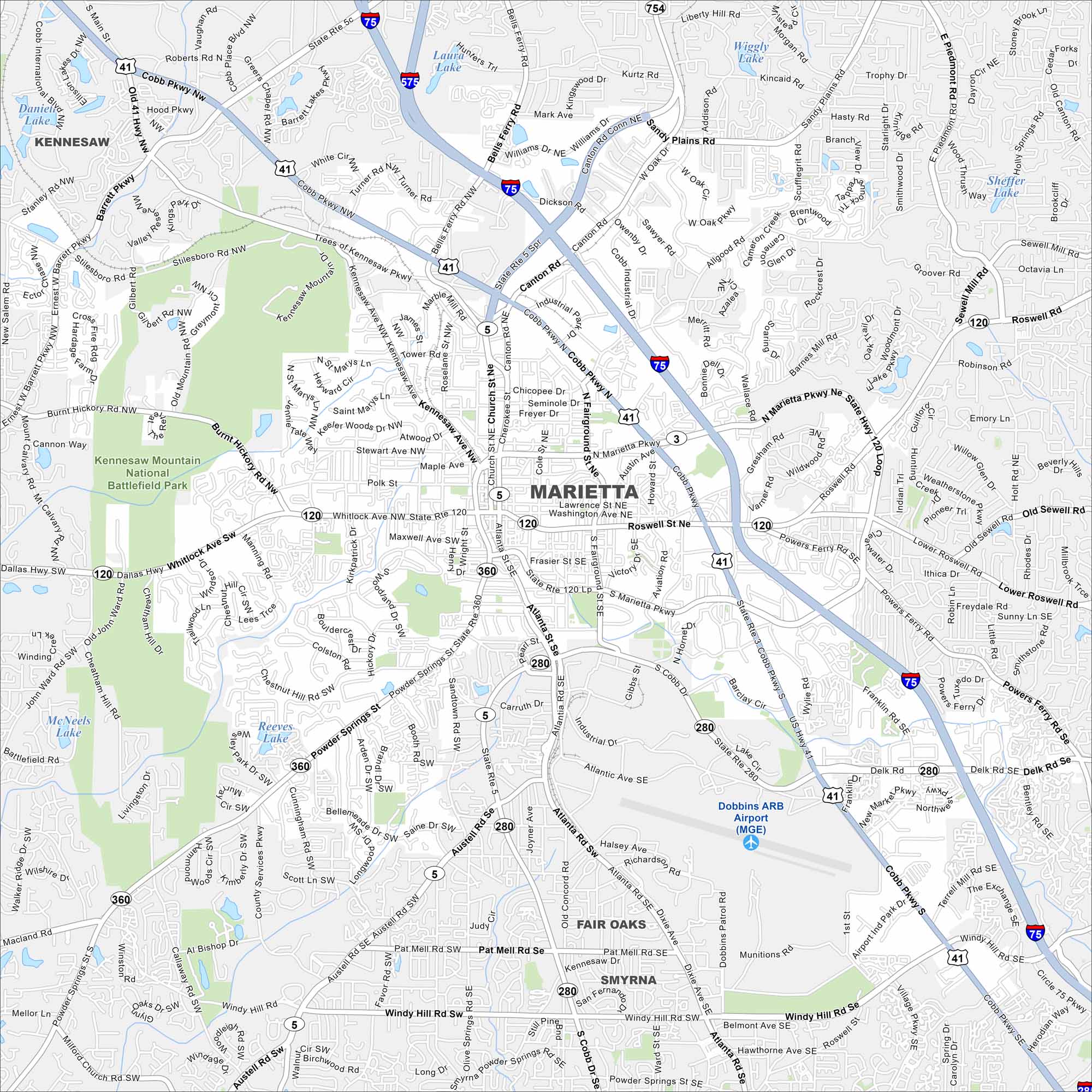See Marietta on our road map. Interstate 75 runs beside the city, linking it with downtown. The Chattahoochee River flows to the east.
