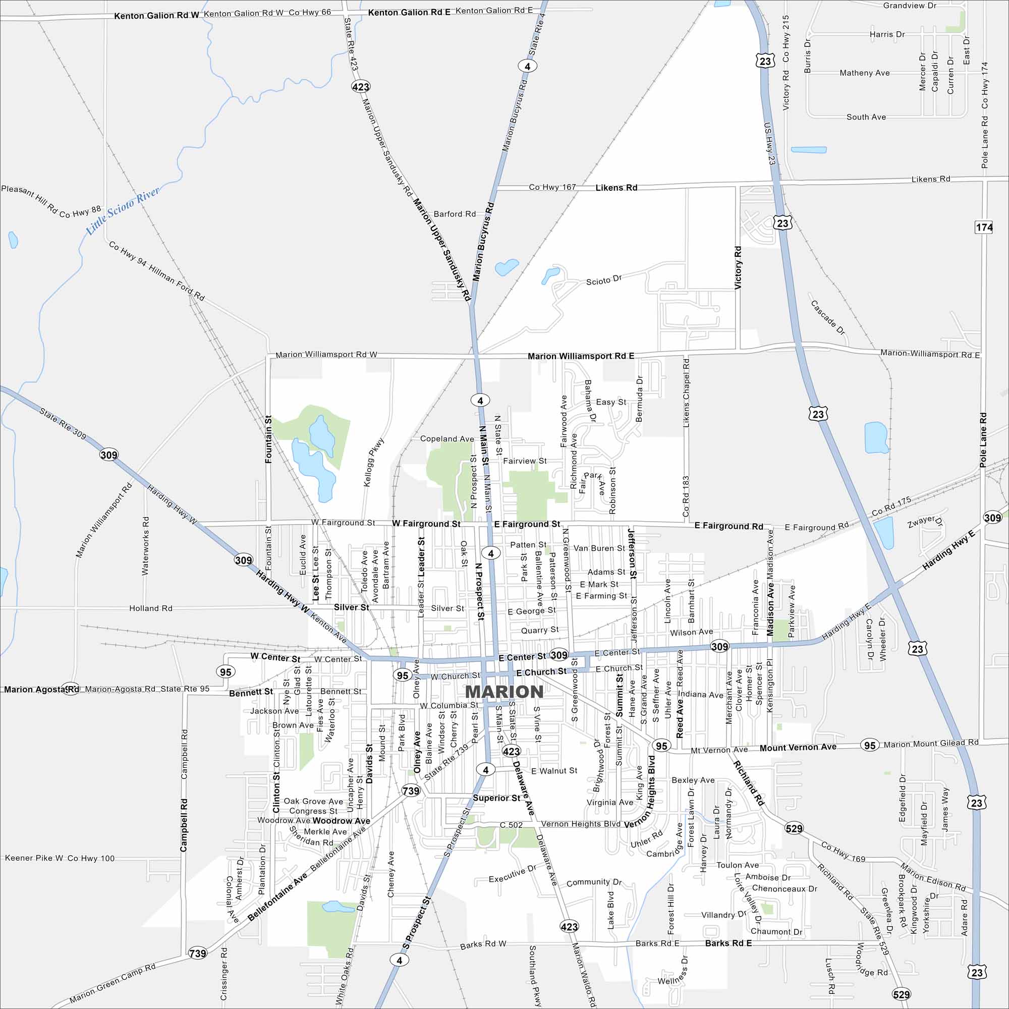 Marion lies north of Columbus in central Ohio. Our map highlights its highway connections, rail lines, and downtown area. Open farmland surrounds the city on all sides.