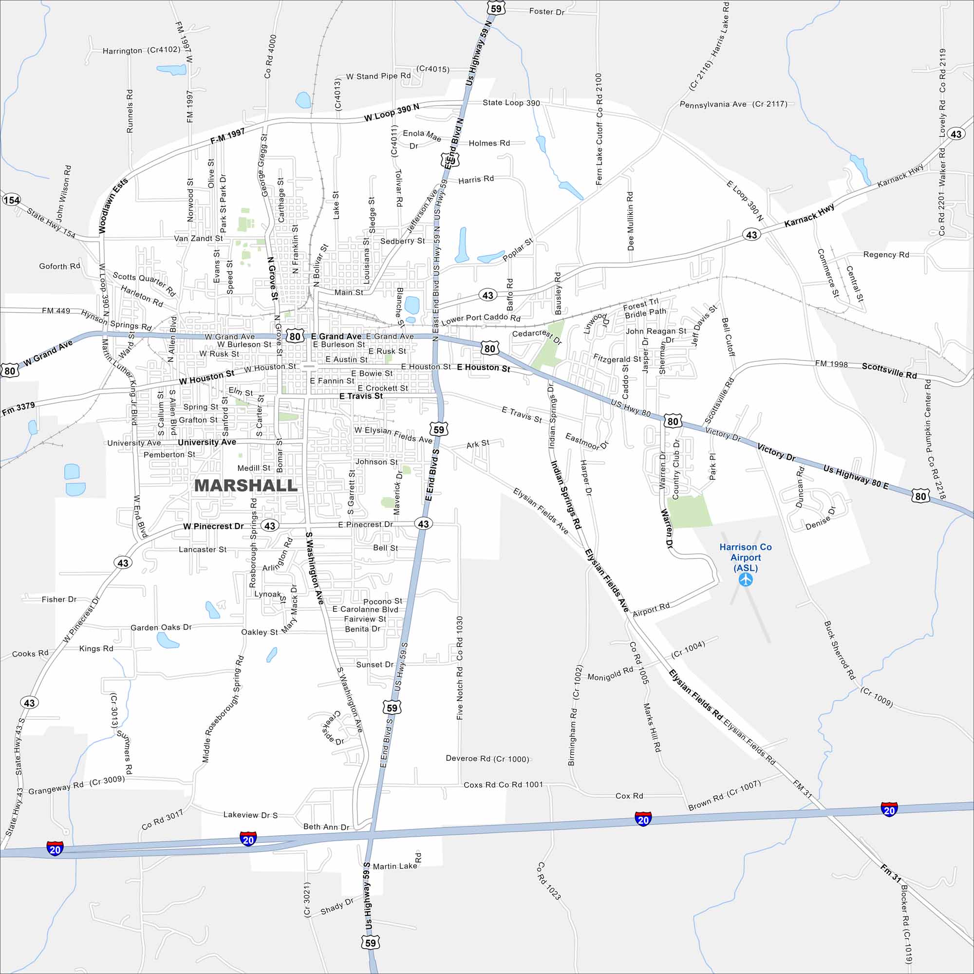 Marshall lies in northeast Texas near the Louisiana border. Our map shows its highways meeting around the downtown grid. Forested land and small lakes surround the city.
